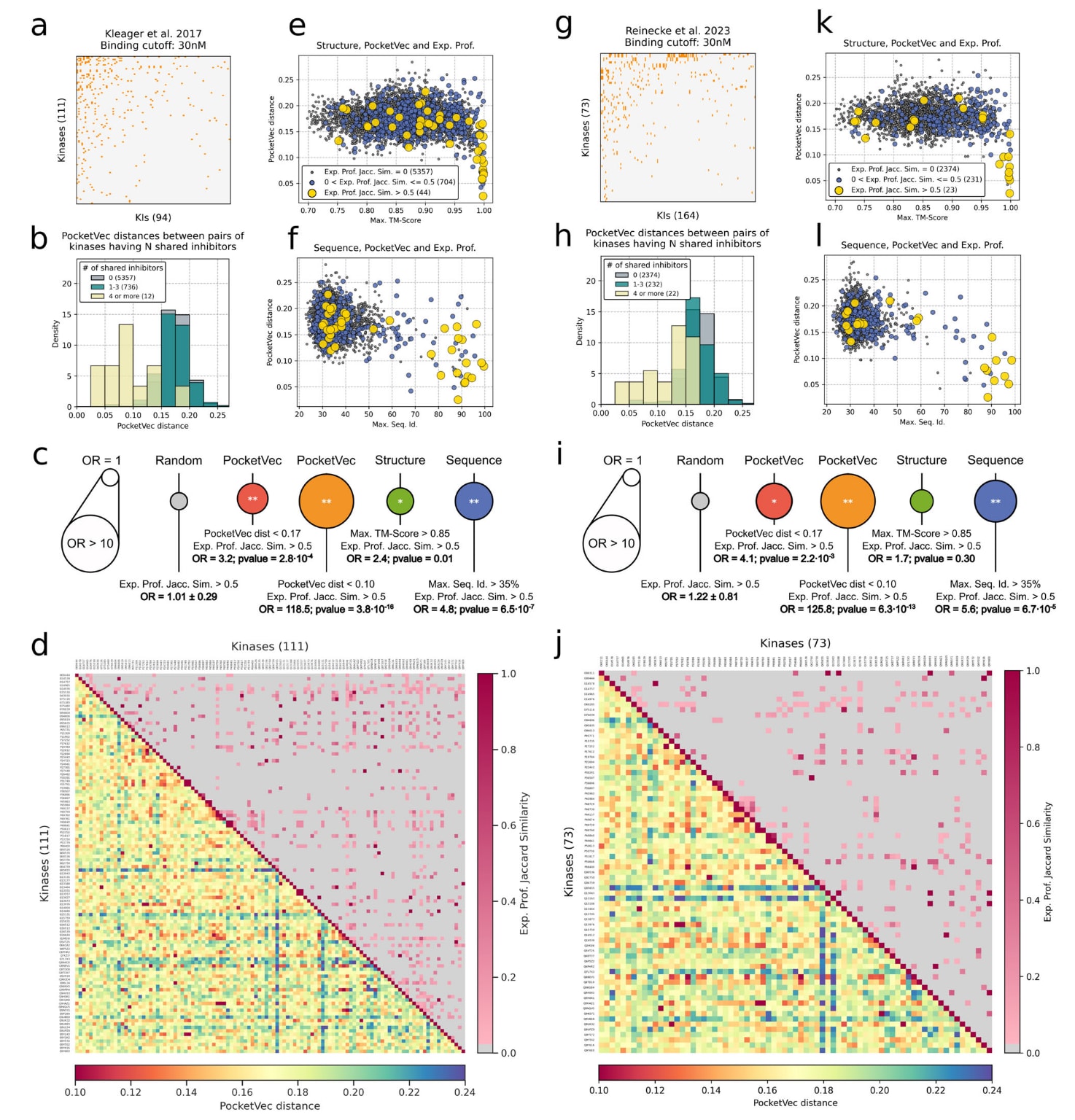 图7|抑制谱与PocketVec描述符之间的相关性。 所有分析基于Kleager等人数据集和Reinecke等人数据集完成,右侧面板对应前者,左侧面板对应后者。a、g 在30nM阈值下二值化的蛋白激酶与小分子激酶抑制剂之间的抑制矩阵。激酶与抑制剂均按照活性抑制事件数量排序。橙色点表示存在抑制作用,白色点表示无抑制作用。b、h 按激酶之间共享抑制剂数量分组的PocketVec距离分布,分组为0个、1–3个以及4个及以上。括号中标注各分组对应的激酶对数量。c、i 对PocketVec距离相似红色小于0.17、橙色小于0.10、结构相似性TM-score大于0.85以及序列一致性大于35%的激酶对,其抑制谱相似Jaccard相似性大于0.5的富集情况,采用双侧Fisher精确检验。灰色为随机选择激酶对的对照结果。圆圈面积与对应优势比OR成比例,中心标注p值,*表示p值小于0.05,**表示p值小于0.001。d、j 激酶两两比较矩阵。行与列为按UniProtID字母顺序排列的激酶。上三角矩阵基于实验确定的抑制谱进行比较,每个方格表示两个靶标抑制谱之间的Jaccard相似性,相似性越高表示抑制谱越相似。下三角矩阵基于PocketVec描述符进行比较,采用蛋白激酶结构域中所有PocketVec描述符之间的最小距离。每个方格颜色表示两个靶标之间的最小PocketVec距离,距离越小红色表示口袋层面越相似。e、k 激酶对之间结构相似性横轴最大TM-score与PocketVec距离纵轴之间的关系。每个点代表一对激酶,颜色与大小根据实验抑制谱相似性编码。f、l 激酶对之间序列相似性横轴最大序列一致性与PocketVec距离纵轴之间的关系。每个点代表一对激酶,颜色与大小根据实验抑制谱相似性编码。原始数据见SourceData文件。
