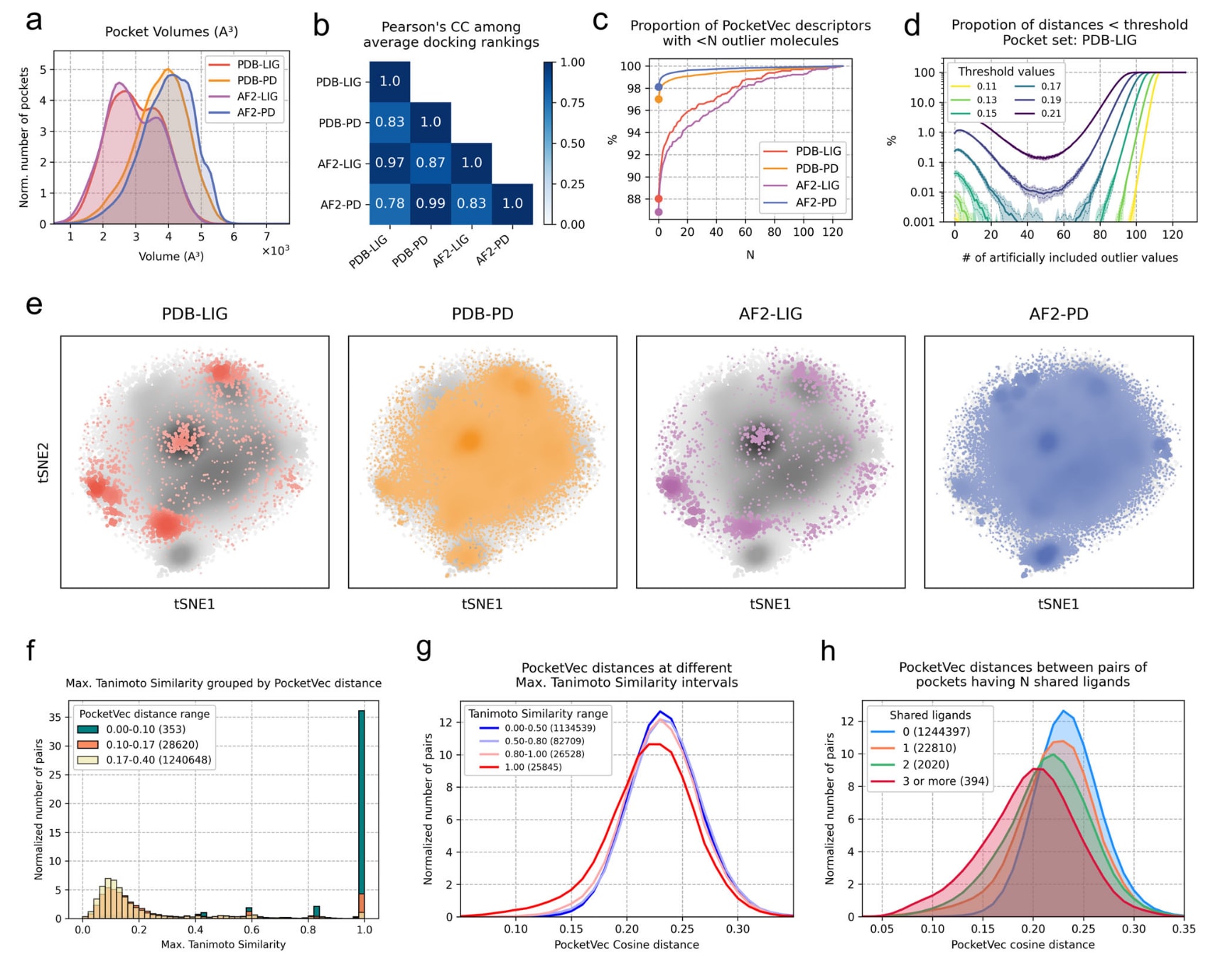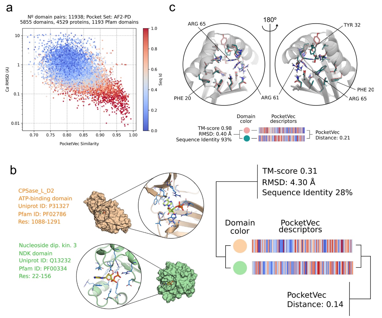 提出了PocketVec方法,该方法基于逆向对接与化学生物组学原则即相似口袋结合相似配体,构建向量化蛋白口袋描述符。系统基准评估表明,其性能位列当前最佳方法之列,并克服了若干重要局限。通过结合实验解析结构与AF2模型,在人类折叠蛋白质组中系统识别出超过32000个结合位点,覆盖20000多个蛋白结构域,并为每个结合位点生成PocketVec描述符,随后进行超过12亿次两两比较的全局相似性分析。