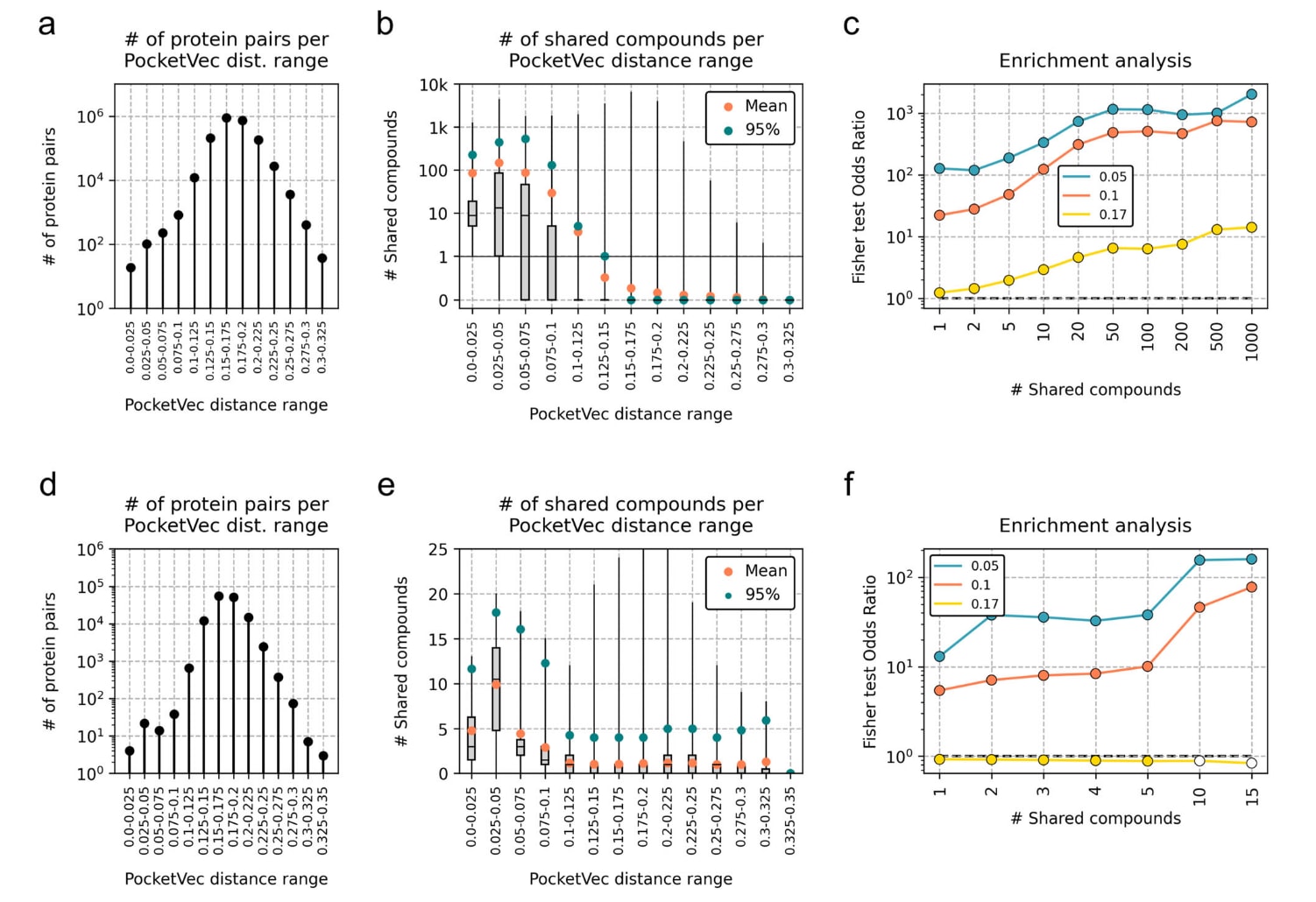图6|PocketVec相似性与实验确定的化合物—靶标关系之间的关联。 在整合PDB-LIG、PDB-PD、AF2-LIG和AF2-PD四类PocketVec描述符后,进行全局两两比较,分析PocketVec距离与在ChEMBL和BindingDB中具有实验结合数据的蛋白之间共享化合物数量的关系a、b、c以及d、e、f。a、d 各PocketVec距离区间内蛋白对数量纵轴为蛋白对数量,横轴为PocketVec距离区间。b、e 在指定PocketVec距离范围内所有蛋白对之间共享化合物数量的分布。每个箱线图中的数据点数量见图6a和6d。橙色点表示平均值,绿色点表示前5%蛋白对中的下限值。箱线图显示中位数、25百分位数与75百分位数以及最大值和最小值。c、f 在不同PocketVec距离截断值0.05、0.10和0.17下,随着共享化合物数量增加,Fisher双侧检验的优势比OR变化趋势纵轴为OR,横轴为共享化合物数量。彩色点表示p值小于0.001,灰色点表示p值小于0.05,白色点表示p值大于0.05。原始数据见SourceData文件。