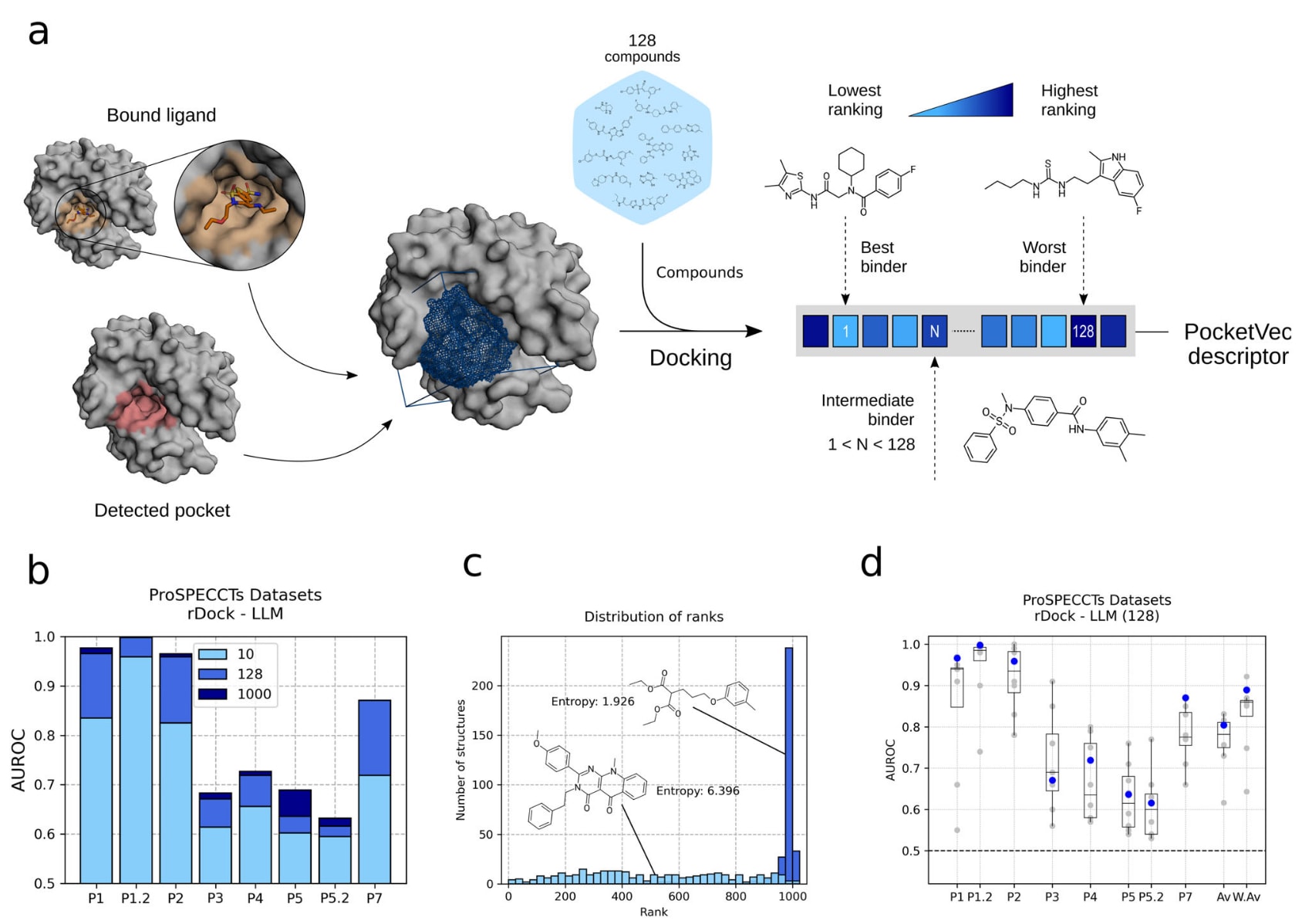 图1|PocketVec方法流程与基准测试结果。 a 给定一个蛋白质三维结构后,通过已结合配体的存在或利用口袋检测算法确定结合位点位置。随后,将预定义的小分子集合在标准PocketVec流程中为128个类先导分子对目标口袋进行对接。对应的对接评分被转换为排序结果,并以向量形式存储,用于表征该口袋。这些向量被称为PocketVec描述符。b 柱状图展示在ProSPECCTs各数据集上的性能表现,纵轴为AUROC,横轴为数据集编号,其中P6和P6.2未包含在内,具体说明参见方法部分BenchmarkSet。柱状颜色表示预定义分子数量,分别为10个、128个以及完整的1000个类先导分子集合,分子按熵值排序。这些结果对应于rDock刚性对接与类先导分子组合。其他所有分子数量组合的结果见图S7。c 高熵与低熵预定义分子示例。直方图展示在ProSPECCTsP1数据集中,最高熵类先导分子与最低熵类先导分子的排序分布情况,纵轴为分布频数,横轴为排序区间,分箱宽度为25。天空蓝表示高熵分子,深蓝表示低熵分子。图中同时给出相应分子的化学结构及对应熵值。d 不同口袋描述符在ProSPECCTs数据集上的性能比较,纵轴为AUROC,横轴为数据集编号,P6和P6.2未包含。灰色点表示现有口袋描述符策略的单独性能结果,共8种方法,详见表S1。箱线图显示中位数、25百分位数与75百分位数以及1.5倍四分位距范围内的最大值与最小值。蓝色点表示PocketVec描述符在128个类先导分子与rDock刚性对接条件下的性能。Av.表示各方法在所有ProSPECCTs数据集上的平均性能,W.Av.表示根据各数据集中样本对数量加权后的平均性能。原始数据见SourceData文件。