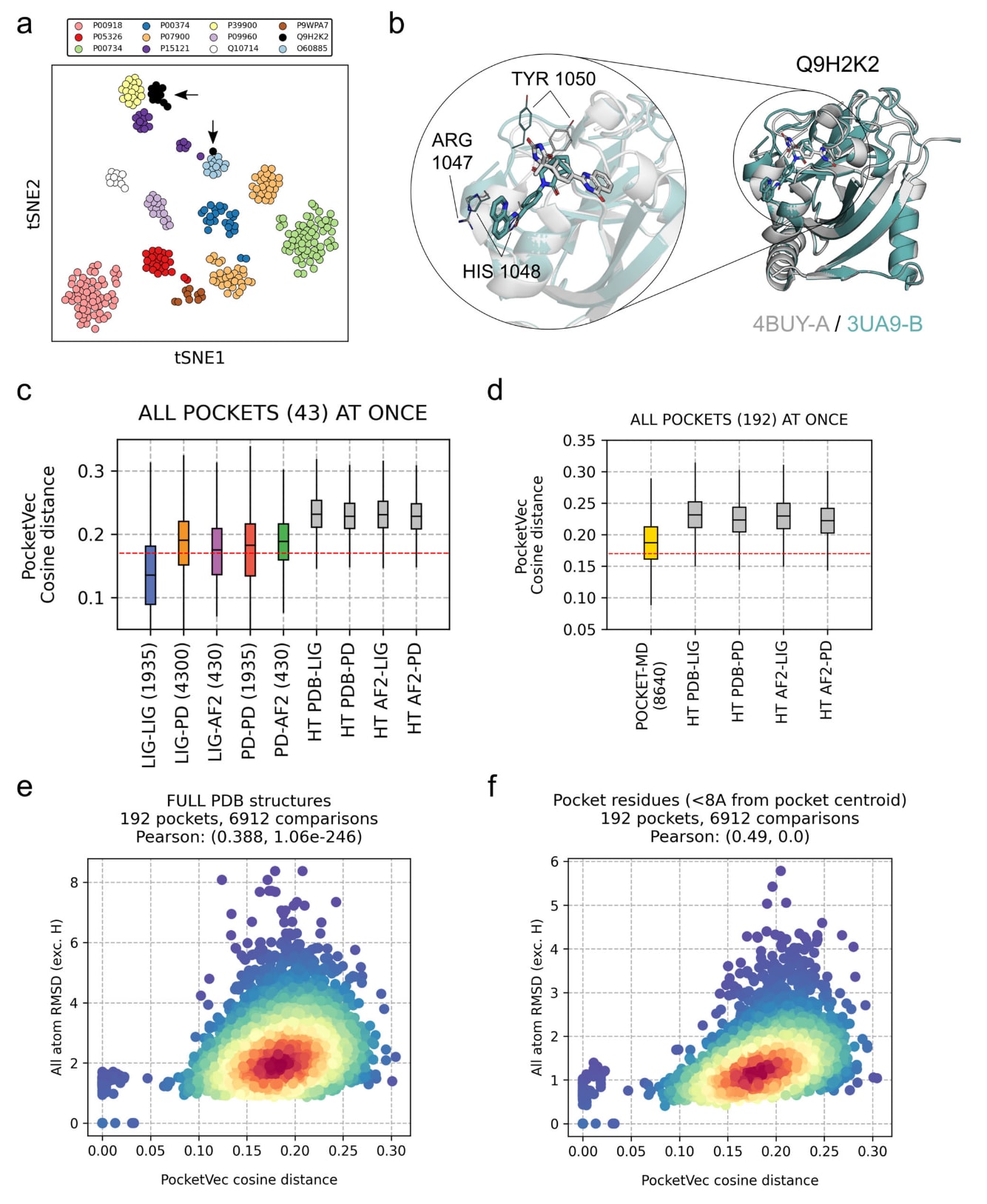 图4|蛋白柔性影响的评估。 a 326个PocketVec描述符的二维tSNE表示,这些描述符对应12个结合不同配体的口袋构象集合,来源于ProSPECCTsP1数据集。黑色箭头标示Poly-ADP polymerase tankyrase-2相关结构。b 使用TM-align对4BUY_A白色结构与3UA9_B青绿色结构进行结构叠合的结果。c 蛋白柔性与构象变化引起的PocketVec描述符变异性。每个箱线图表示同一口袋在不同结构比较情境下的PocketVec距离分布,包括i)holoPDB结构之间LIG-LIG共1935对,ii)holo与apoPDB结构之间LIG-PD共4300对,iii)holoPDB与AF2结构之间LIG-AF2共430对,iv)apoPDB结构之间PD-PD共1935对,v)apoPDB与AF2结构之间PD-AF2共430对。此外,还比较holoLIG、apoPD及AF2结构与研究中预先生成的四类PocketVec描述符集合即PDB-LIG、PDB-PD、AF2-LIG及AF2-PD之间的距离分布,样本数分别为1439382、12974304、1255170及29039577。箱线图显示中位数、25百分位数与75百分位数以及1.5倍四分位距范围内的最大与最小值。d 分子动力学模拟结构所导致的PocketVec描述符变异性。POCKET-MD表示同一口袋不同MD构象之间的距离共8640对,其余箱线图表示这些MD来源描述符与预先计算的四类PocketVec集合之间的距离分布,样本数分别为3060480、27586560、2668800及61745280。箱线图表示方式同上。e PocketVec余弦距离与全原子RMSD不含氢原子之间的相关性,横轴为PocketVec距离,纵轴为全结构RMSD。f PocketVec余弦距离与仅口袋残基RMSD之间的相关性。分析涉及192个口袋,其中8个来自PDB-LIG,184个来自PDB-PD,均包含MD模拟数据每个重复3帧共3个重复。两图均以密度着色表示,颜色越红表示密度越高。原始数据见SourceData文件。