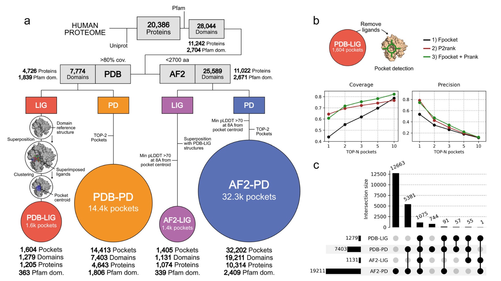 首先,从UniProt数据库中获取全部20386个人类蛋白序列。为避免处理无序或高度柔性的区域,这类区域通常难以建模且不太可能包含可成药口袋,仅保留Pfam定义的自主结构单元即结构域。最终共保留28044个结构域,涵盖11242个人类蛋白,对应2704个唯一Pfam结构域。