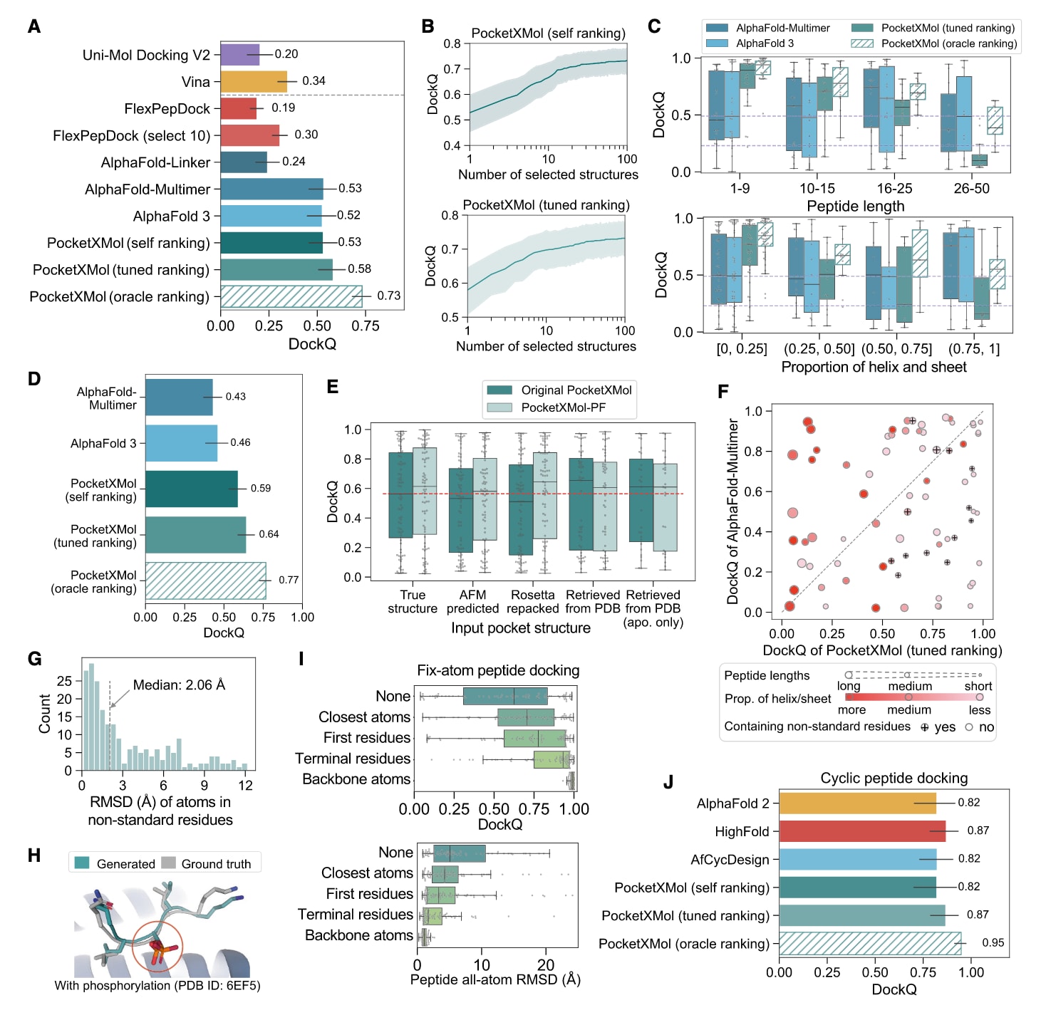 图7|肽分子对接性能评估 (A)在PepBDB测试集上的肽分子对接DockQ评分。柱状图展示平均值及95%置信区间(n=79)。(B)在每个结合口袋从100个生成结构中选择不同数量构象时的对接表现。折线图展示平均值及95%置信区间(n=79)。(C)DockQ评分与肽长度(上)以及螺旋与折叠结构比例(下,n=79)之间的关系。箱线图展示四分位数及1.5×IQR范围。(D)在BioLiP测试集上的肽分子对接DockQ评分。柱状图展示平均值及95%置信区间(n=79)。(E)在PepBDB测试集上,不同PocketXMol变体以及不同输入口袋结构条件下的对接结果。箱线图展示四分位数及1.5×IQR范围。(F)在PepBDB测试集上,PocketXMol与AlphaFold-Multimer之间DockQ评分的直接比较。(G)非天然氨基酸(NAAs)中原子的对接RMSD。(H)一个含有磷酸化修饰的已对接肽结构示例。(I)在引入先验知识条件下,PocketXMol的肽分子对接性能。箱线图展示四分位数及1.5×IQR范围(n=79)。(J)环肽对接的DockQ评分,先在簇内取平均,再在簇间取平均。误差线表示95%置信区间(n=79)。