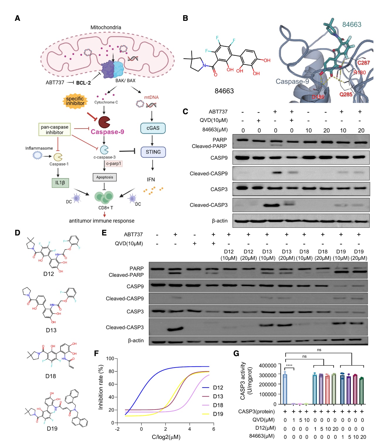 图3|Caspase-9抑制剂设计。 (A)caspase-9相关信号通路示意图。(B)设计分子84663及PocketXMol生成的结合构象。黄色虚线表示由PyMOL识别的极性相互作用,相关氨基酸以残基名称和编号标注。(C)Western blot检测PARP及caspase-9/-3的表达水平。MC38细胞分别接受QVD或84663处理,并与或不与ABT-737(10μM)联合处理。“CASP”为“caspase”的基因名称。(D)第二轮优化并验证可结合caspase-9的分子(D12、D13、D18和D19)。(E)Western blot检测PARP及caspase-9/-3表达。MC38细胞接受不同caspase抑制剂处理,并与或不与ABT-737联合使用。(F)caspase-3活性实验用于测定各分子抑制由caspase-9介导的ABT-737诱导caspase-3活化的半数有效浓度(EC50)。(G)利用caspase-3检测试剂盒,对caspase-3蛋白(0.5ng/mL)与不同caspase抑制剂混合后的酶活性进行分析。另见图S3。