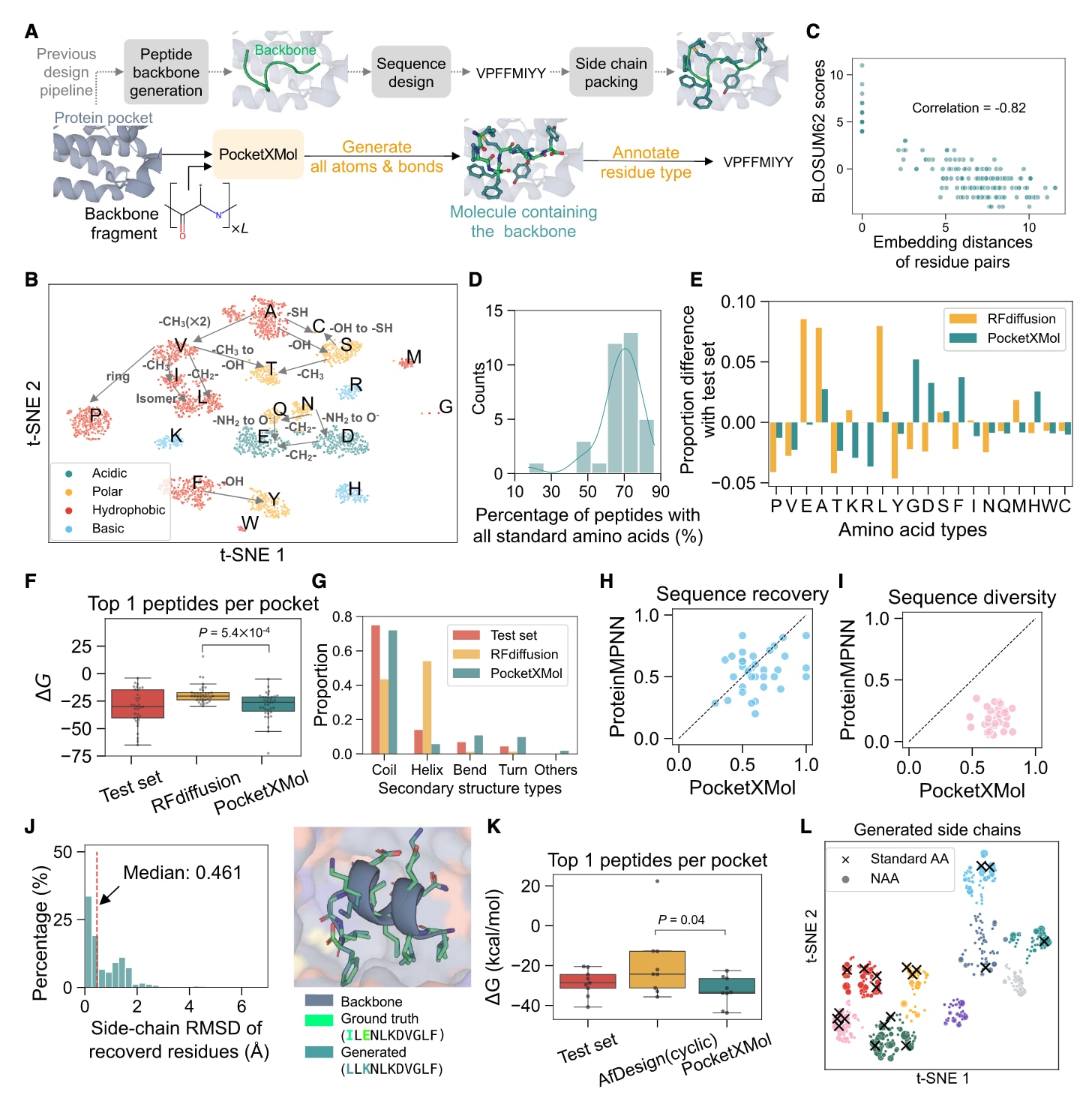 图4|多肽设计性能。 (A)PocketXMol与传统多肽设计流程的差异。(B)BLOSUM62替换得分与氨基酸嵌入距离之间的关系。(C)氨基酸嵌入的t-SNE可视化结果。(D)测试集中各蛋白口袋生成的由标准氨基酸组成的多肽比例。(E)生成多肽与测试集在氨基酸组成上的差异。(F)蛋白-多肽复合物的Rosetta结合能分布。