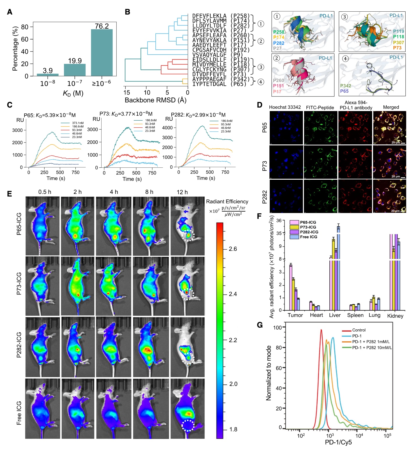 图5|PD-L1结合多肽设计。 (A)不同解离常数范围内设计多肽所占比例。(B)