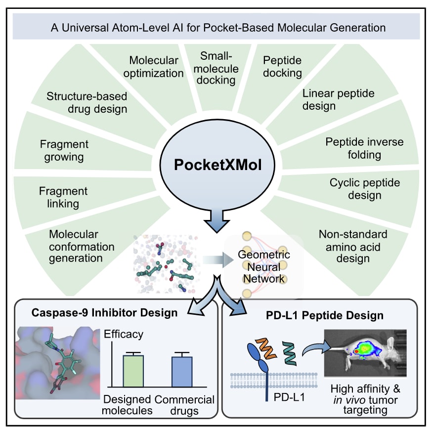 该研究提出了PocketXMol,一种原子级模型,用于统一处理与蛋白口袋相互作用相关的生成式任务。通过将原子提示作为任务规范,该模型无需针对具体任务进行微调,即可支持多种分子建模任务,包括小分子和多肽的结构预测以及从头设计。在13项计算基准测试中,PocketXMol在其中11项上取得了优异表现,在其余两项上也保持竞争力,整体性能超过55个基线模型。在实际应用中,该模型被用于设计抑制caspase-9的小分子,其抑制效果可与商业化的广谱caspase抑制剂相媲美。同时,利用PocketXMol生成了能够结合PD-L1的多肽,其成功率显著高于传统文库筛选方法。选取的三个代表性多肽进一步接受实验验证,结果证实了其在细胞水平上的特异性,并表明其在分子探针开发和治疗应用方面具有潜在价值。总体而言,PocketXMol为人工智能辅助药物发现提供了一个通用平台,并为未来更广泛的应用场景奠定了基础。