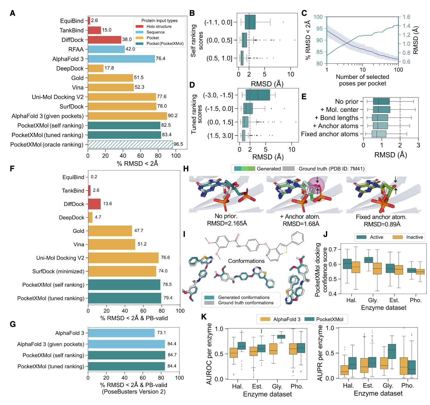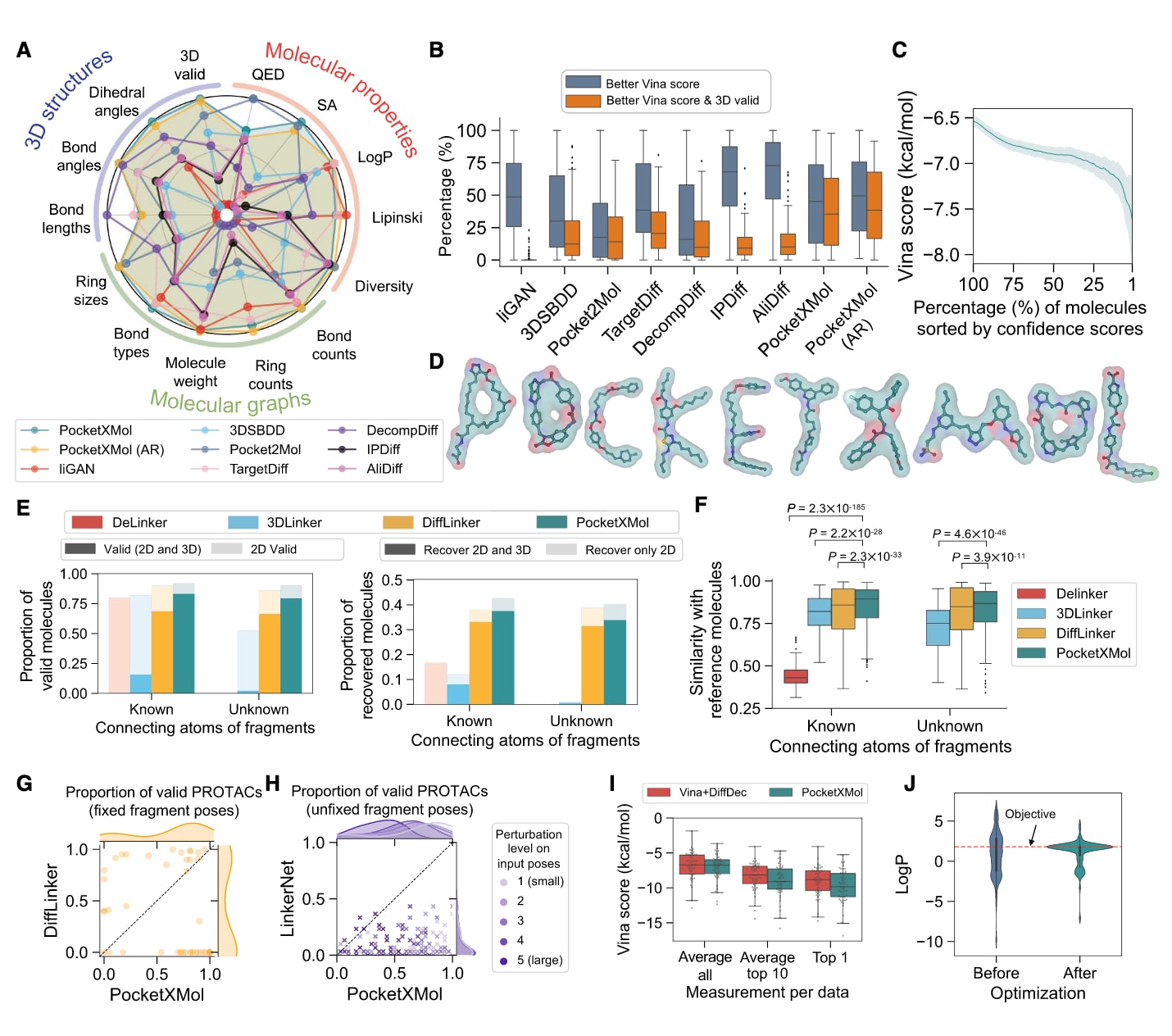 PocketXMol在不依赖蛋白口袋条件下即可为小分子生成有效构象。按照既有研究的评测流程,将其与专门的构象预测工具进行比较。结果显示,PocketXMol的性能与专业方法相当(表S6),并能够恢复与低能量真实构象高度一致的三维结构(图6I),表明其在构象空间建模方面具备良好能力。