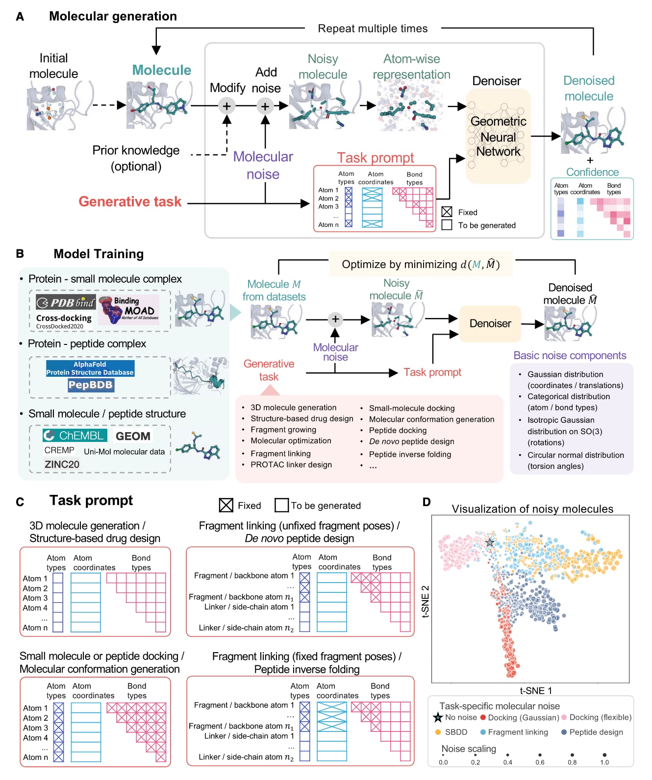 图1|PocketXMol框架。 (A)生成流程的示意图。(B)训练过程示意。PocketXMol采用通用去噪框架,整合来自多种分子类型的结构数据,在统一噪声空间中实现多任务联合建模。
