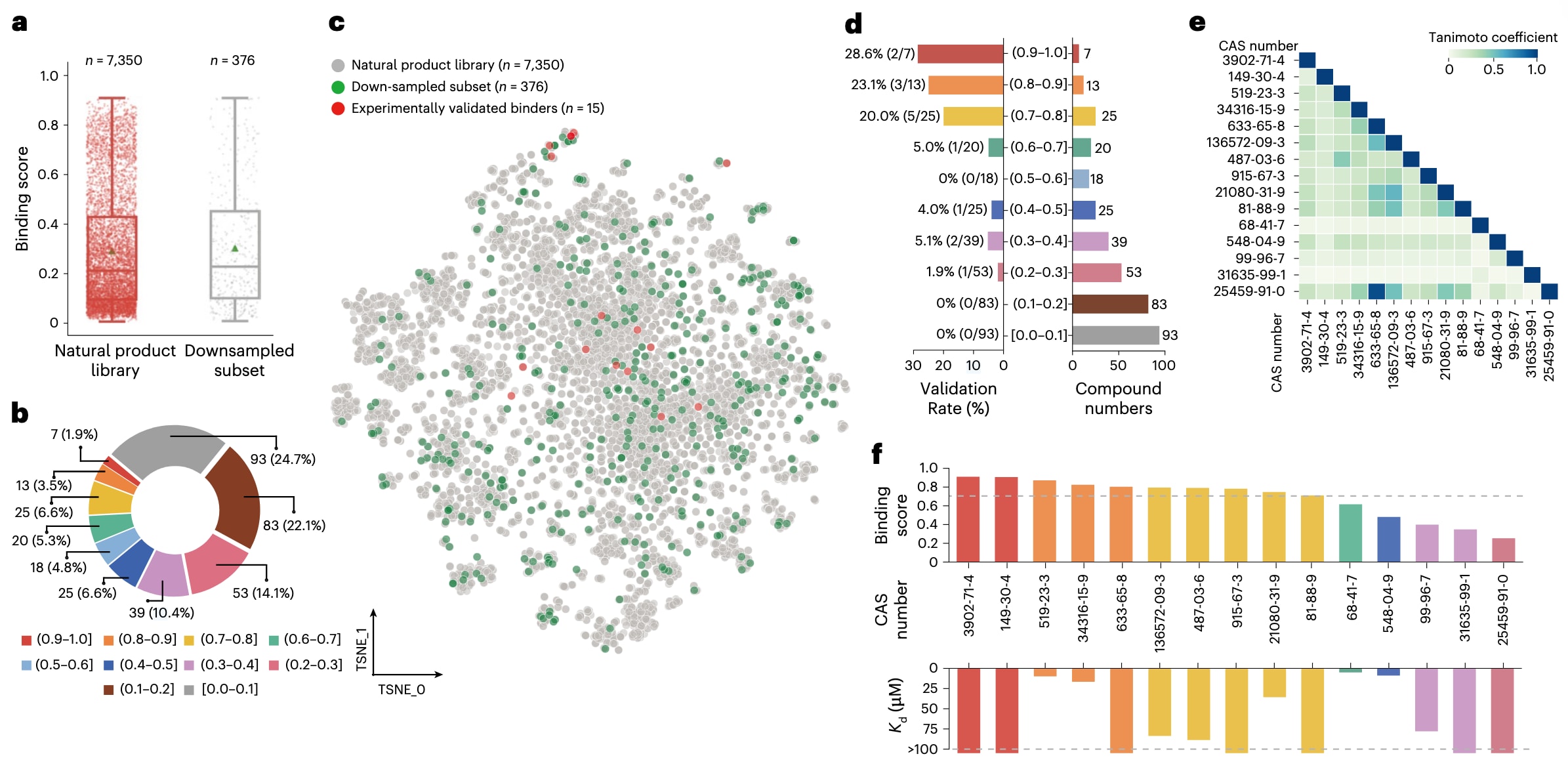 图4|针对不同预测区间的MYC IRES靶向化合物的实验验证结果。 a,SMRTnet对天然产物文库(左)及其下采样子集(右)中靶向MYC IRES的化合物所预测的结合评分分布。数据以箱线图叠加散点图形式呈现,中线表示中位数,箱体上下边界分别为第一和第三四分位数,须线表示IQR×1.5,绿色三角形表示平均值。每个点代表一个化合物与MYC IRES之间的预测结合评分。b,环形图展示在十个预测区间内抽样化合物的数量及比例分布。c,不同化合物数据集的Morgan指纹t-SNE分析结果,包括天然产物文库(n=7350)、下采样子集(n=376)以及从下采样子集中经MST实验验证的结合分子(n=15)。d,下采样子集中被选中化合物在十个预测区间内的分布(右)及其对应的实验验证率(左)。分子式中的分子表示实验验证为结合分子的数量,分母表示随机选取用于实验验证的化合物总数,百分比表示各区间内的验证率。e,与MYC IRES发生相互作用的15个经实验验证化合物的结构相似性分析,采用Tanimoto相似度进行度量。f,15个经实验验证的MYC IRES靶向化合物的预测结合评分与