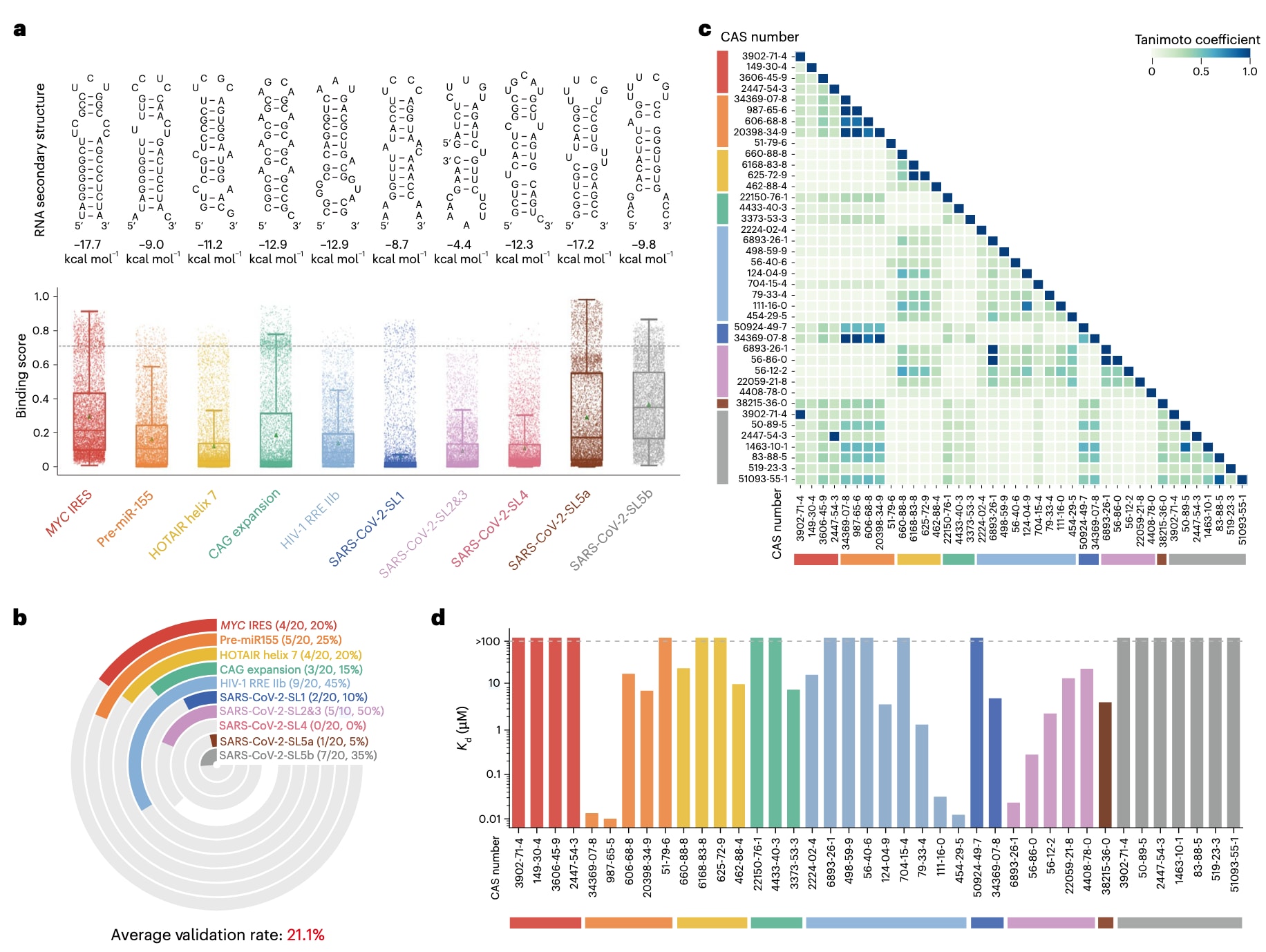 图3|疾病相关RNA靶标的实验验证结果。 a,上图为十个疾病相关RNA靶标的二级结构,其最小自由能由RNAstructure计算得到;下图为SMRTnet在天然产物文库上对这些RNA靶标预测的结合评分分布。数据以箱线图叠加散点图形式呈现,中线表示中位数,箱体上下边界分别为第一和第三四分位数,须线表示IQR×1.5,绿色三角形表示平均值。每个点代表一个化合物与对应RNA靶标之间的预测结合评分(n=7350),灰色虚线表示SMRTnet的分类阈值(0.704)。b,SMRTnet预测结果经微尺度热泳动(MST)实验验证的命中率。彩色区域表示被验证为具有结合能力的化合物,灰色区域表示被验证为不结合的化合物。分子式中的分子表示实验验证为结合分子的数量,分母表示选取进行实验验证的高排名化合物总数,百分比表示各RNA靶标的验证命中率。c,与十个疾病相关RNA靶标发生相互作用的40个化合物的结构相似性分析,采用Tanimoto相似度进行度量。化合物按照其对应RNA靶标进行分组。d,柱状图展示十个疾病相关RNA靶标上40个经实验验证的化合物–RNA相互作用的解离常数