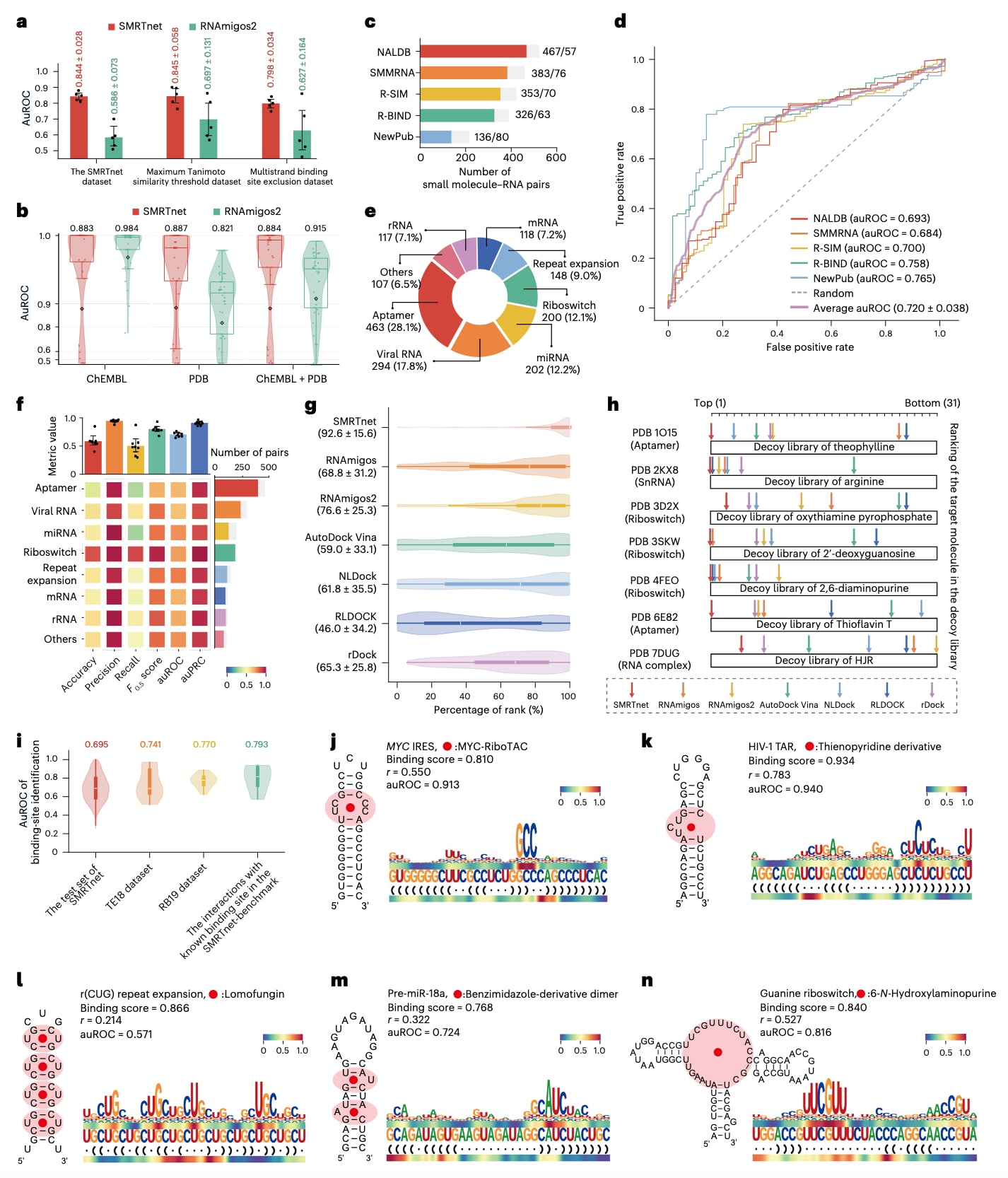 图2|SMRTnet的性能表现。 a,SMRTnet与RNAmigos2在不同测试集上的性能比较,包括SMRTnet原始测试集、施加最大Tanimoto相似度阈值0.7后的修订测试集,以及排除相同多链结合位点后的修订测试集。柱状图叠加散点图展示了在正负样本比例为1:2及其变体条件下,基于五折交叉验证(n=5)得到的auROC结果。粗实线表示五折交叉验证的标准差,数据以均值±标准差形式呈现。b,在RNAmigos2完整测试集上,比较在RNAmigos2子集上重新训练的SMRTnet与RNAmigos2的性能。测试中使用来自不同分子库的诱饵,包括ChEMBL(n=500)、PDB(n=264)以及ChEMBL+PDB(n=764)。数据以箱线图和小提琴图叠加散点图形式展示(n=37),中线表示中位数,箱体上下边界分别为第一和第三四分位数,须线表示IQR×1.5,各分布的均值以数字标注。c,五个实验验证基准数据集中小分子–RNA配对的统计情况。柱状图展示各基准中相互作用(彩色)与非相互作用(灰色)的小分子–RNA配对数量,这些数据统称为SMRTnet-benchmark数据集。d,SMRTnet在SMRTnet-benchmark数据集上的ROC曲线及auROC值,包括NALDB(n=524)、SMMRNA(n=459)、R-SIM(n=423)、R-BIND(n=389)和NewPub(n=216)。e,环形图展示SMRTnet-benchmark数据集中八种RNA类型的比例分布。f,SMRTnet在八种RNA类型上的性能表现,包括aptamer(n=463)、viral RNA(n=294)、miRNA(n=202)、riboswitch(n=200)、repeat expansion(n=148)、mRNA(n=118)、rRNA(n=117)以及others(n=107)。右侧柱状图表示各RNA类型中相互作用(彩色)与非相互作用(灰色)配对数量。上方柱状图表示不同RNA类型的整体性能(n=8),粗实线表示八种RNA类型性能的标准差。g,在诱饵评估任务中,SMRTnet与当前主流工具在SMRTnet测试集(n=684)上的整体性能比较,包括RNAmigos(n=605)、RNAmigos2(n=547)、AutoDock Vina(n=659)、NLDock(n=351)、RLDOCK(n=212)和rDock(n=391)。数据以小提琴图叠加箱线图形式呈现,中线为中位数,箱体上下边界为第一和第三四分位数,小提琴图的上下须线表示IQR×1.5。h,不同计算工具在给定诱饵分子库中对目标分子排名的比较。重叠箭头表示排名并列。箭头越靠左表示目标分子排名越高,越靠右表示排名越低。每个目标分子对应30个诱饵分子。i,SMRTnet在不同数据集上识别结合位点的性能。小提琴图表示SMRTnet在SMRTnet测试集(n=2508)、TE18(n=9)、RB19(n=11)以及SMRTnet-benchmark数据集中具有实验确定结合位点的相互作用(n=5)上的auROC结果。中线表示中位数,箱体上下边界为第一和第三四分位数,小提琴图须线表示IQR×1.5。各数据集上方数字表示结合位点识别的平均auROC值。j–n,SMRTnet对不同RNA的结合位点预测结果,包括MYC IRES(j)、HIV-1 TAR元件(k)、HTT基因中的r(CUG)重复扩增(l)、pre-miR-18a(m)以及鸟嘌呤核糖开关(n)。两条热图轨迹表示SMRTnet在每个核苷酸位置的响应信号,红色表示高注意力区域(HARs)(上轨为序列响应,下轨为结构响应)。RNA结构图中红色圆圈与阴影表示对应小分子的已知结合位点,结合位点周围标注其名称。结合评分在每个小分子–RNA配对之间计算,同时在梯度信号与实验确定结合位点邻近性之间计算Pearson相关系数