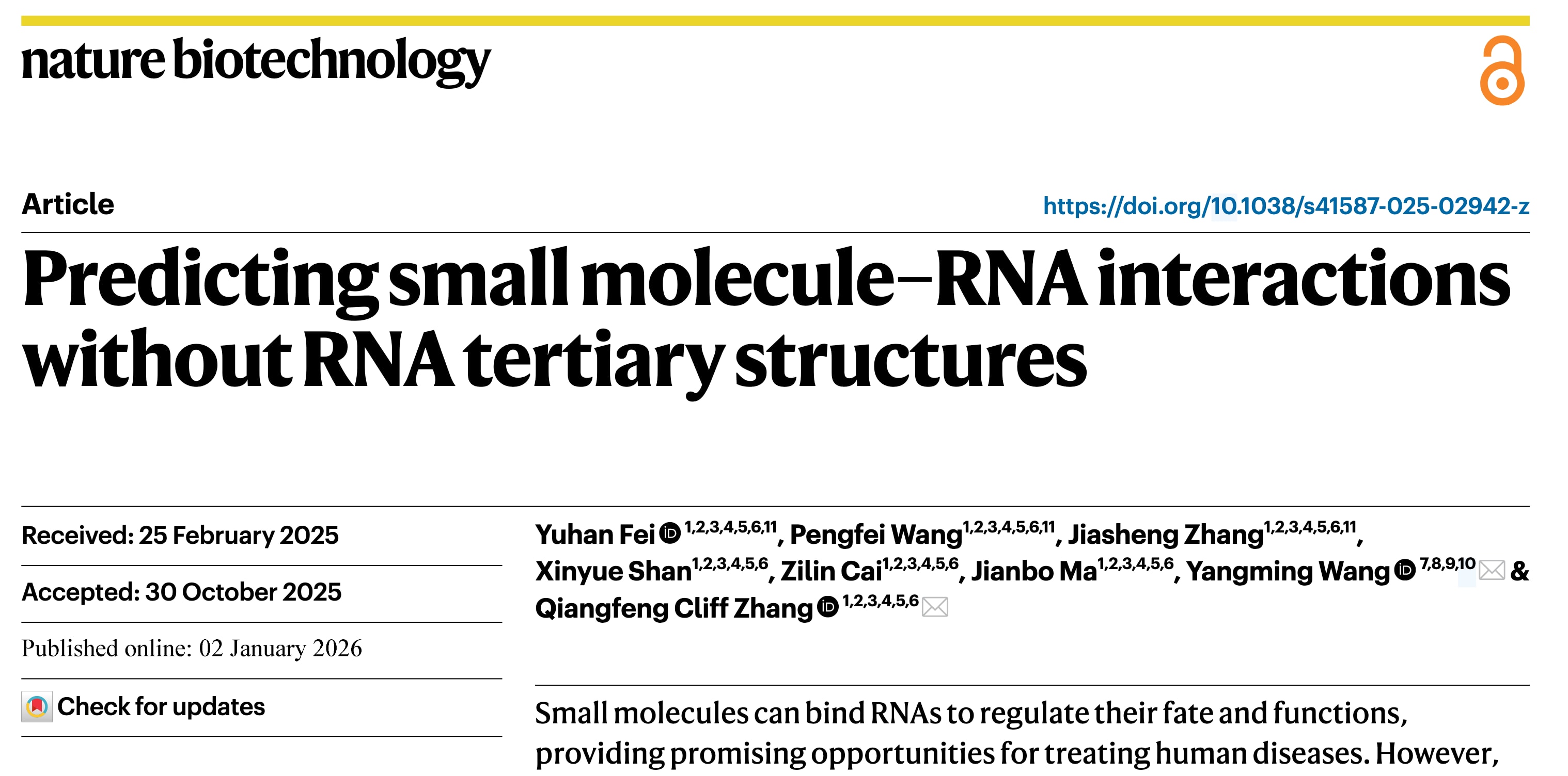 需要强调的是,仅有结合并不意味着小分子必然能够调控RNA表达或产生生物学效应。随着化学-RNA互作组学、转录组学及功能筛选等多组学数据不断积累,未来研究可整合这些多模态信息,特别是基因表达谱与表型读出数据,构建能够同时预测结合相互作用及其下游生物效应的人工智能模型,从而弥合靶标结合与功能影响之间的差距,推动RNA靶向治疗的发展。