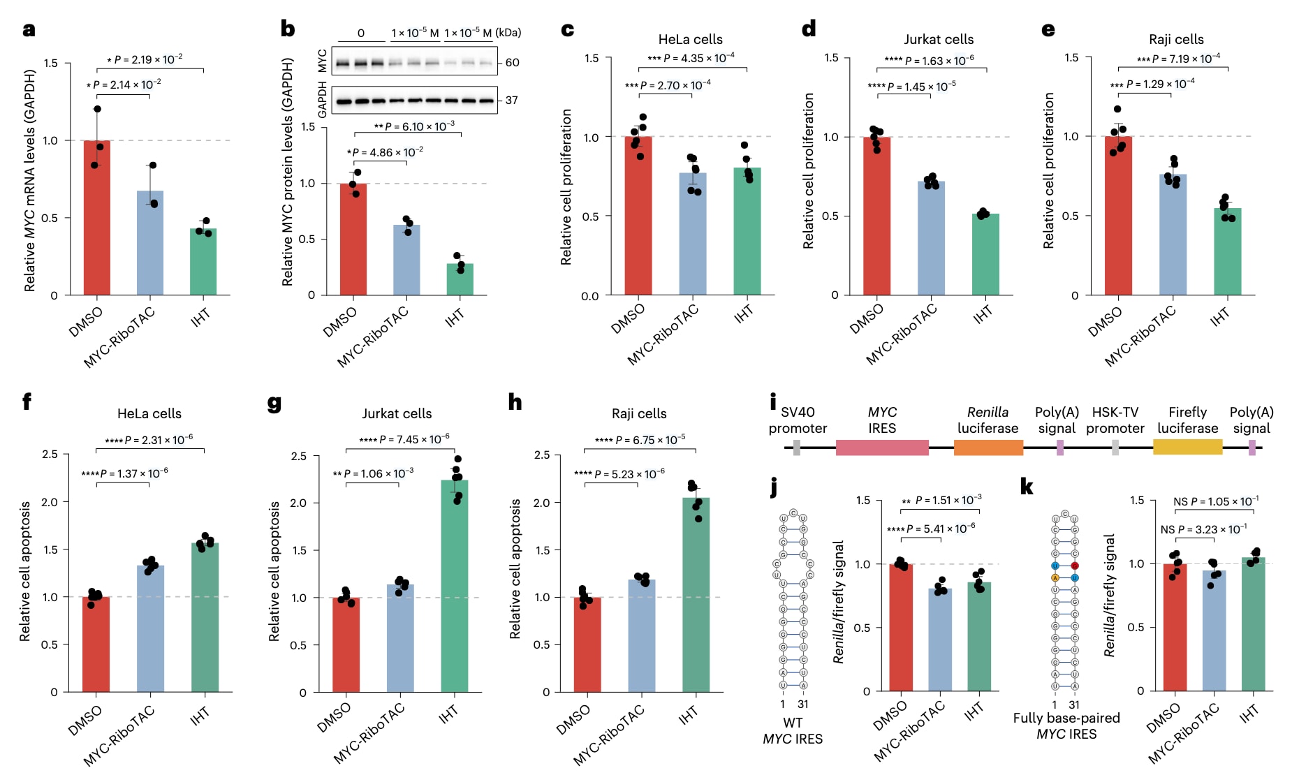 图6|靶向MYC IRES的IHT抑制MYC表达和细胞增殖。 a,b,在HeLa细胞中,以10μM剂量处理48小时后,采用qPCR和western blot分别检测MYC-RiboTAC与IHT对MYC mRNA水平(a)和MYC蛋白水平(b)的影响。数据以