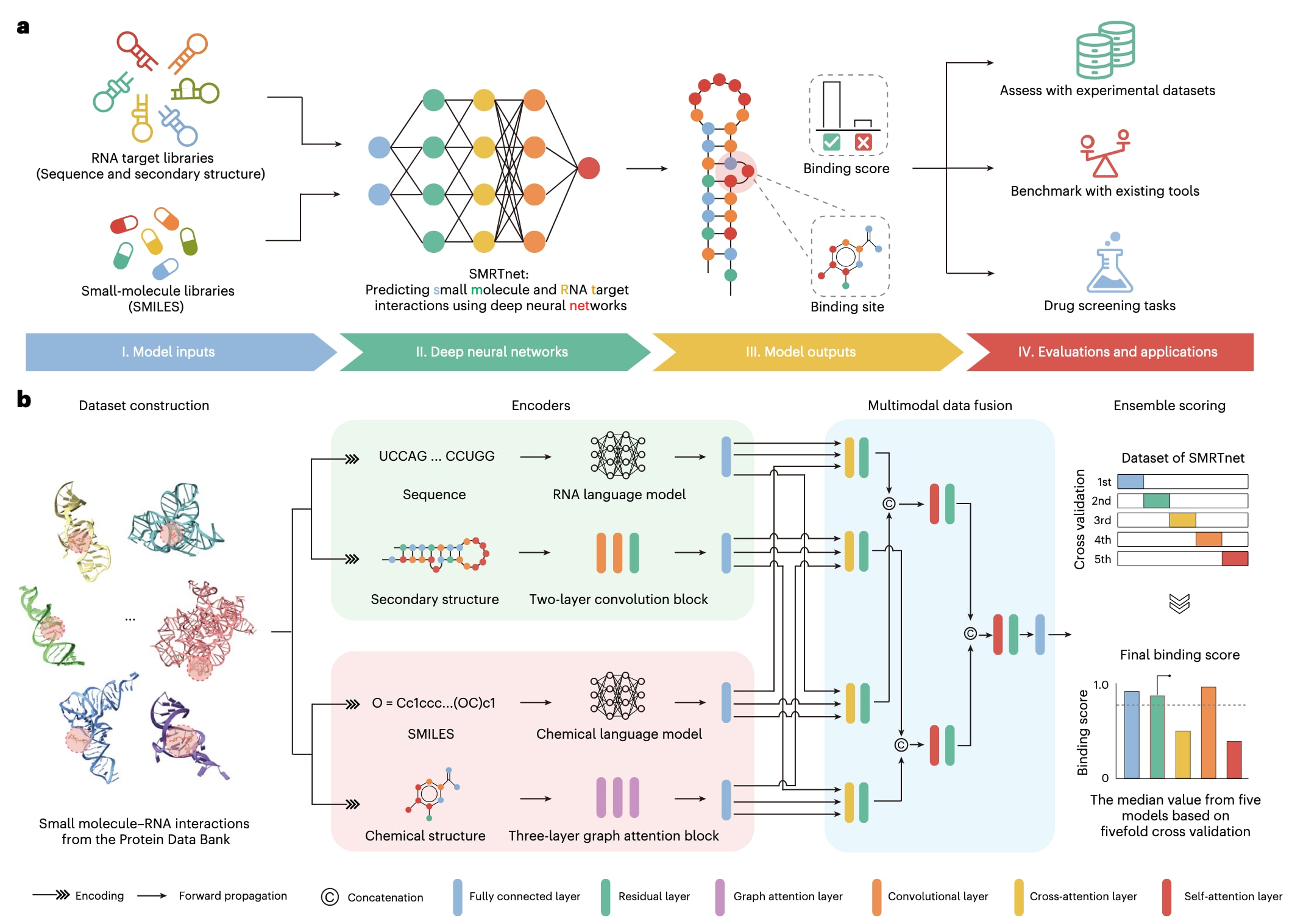 图1|SMRTnet概述。 a,SMRTnet示意图。SMRTnet是一种用于预测小分子–RNA相互作用(SRIs)的深度学习方法。该方法以RNA序列及其二级结构信息,以及以SMILES表示的小分子作为输入,输出结合评分及潜在结合位点。b,SMRTnet的整体架构。训练数据来源于蛋白质数据银行(PDB)。SMRTnet主要由三个核心模块组成:RNA编码器、小分子编码器以及多模态数据融合(MDF)模块。RNA编码器利用RNA语言模型RNASwan-seq对RNA序列进行建模,并通过结合残差神经网络(ResNets)的卷积神经网络(CNNs)处理RNA结构信息。小分子编码器则使用化学语言模型MoLFormer处理小分子的SMILES表示,并通过图注意力网络(GATs)提取其化学结构特征。MDF模块基于注意力机制神经网络逐步整合成对结合信息,随后由全连接神经网络进行解码,预测输入RNA与小分子之间的结合评分。最终,通过集成评分策略生成最终的结合评分结果。