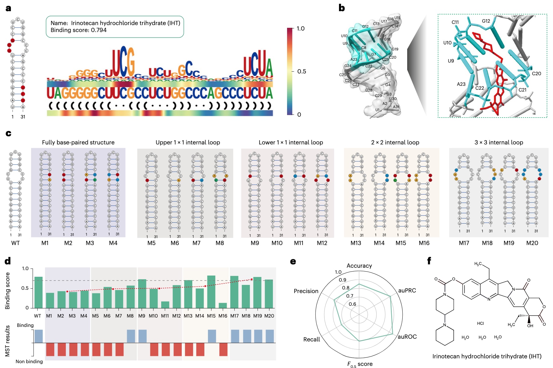 图5|MYC IRES预测结合位点的实验验证。 a,IHT在MYC IRES上的潜在结合位点。RNA二级结构图中以红色标注高注意力区域(HARs),两条热图轨迹显示模型在各核苷酸位置的响应信号,上轨为序列响应,下轨为结构响应,红色表示高注意力。b,利用SimRNA预测的MYC IRES三级结构,其中青色区域表示SMRTnet预测的结合位点;IHT在该位点的分子对接结果通过ChimeraX进行可视化展示。c,20种MYC IRES突变体的二级结构,由RNAstructure预测得到。不同背景颜色表示不同类型的结合位点(上方标注),彩色核苷酸标示突变位置及类型。淡紫色背景表示完全碱基配对结构,亚麻色背景表示上部1×1内部环,浅玫瑰色背景表示下部1×1内部环,木瓜色背景表示2×2内部环,浅灰色背景表示3×3内部环。WT表示野生型。d,不同MYC IRES突变体与IHT之间的预测结合评分分布。下方柱状图为MST实验验证结果。红点表示相同结合位点类型下的平均结合评分,红色虚线表示随着结合位点类型变化的结合评分趋势,灰色虚线表示SMRTnet的分类阈值(0.704)。e,雷达图展示IHT与20种MYC IRES突变体之间计算预测结果与实验验证结果的一致性。f,IHT的化学结构及其全称。