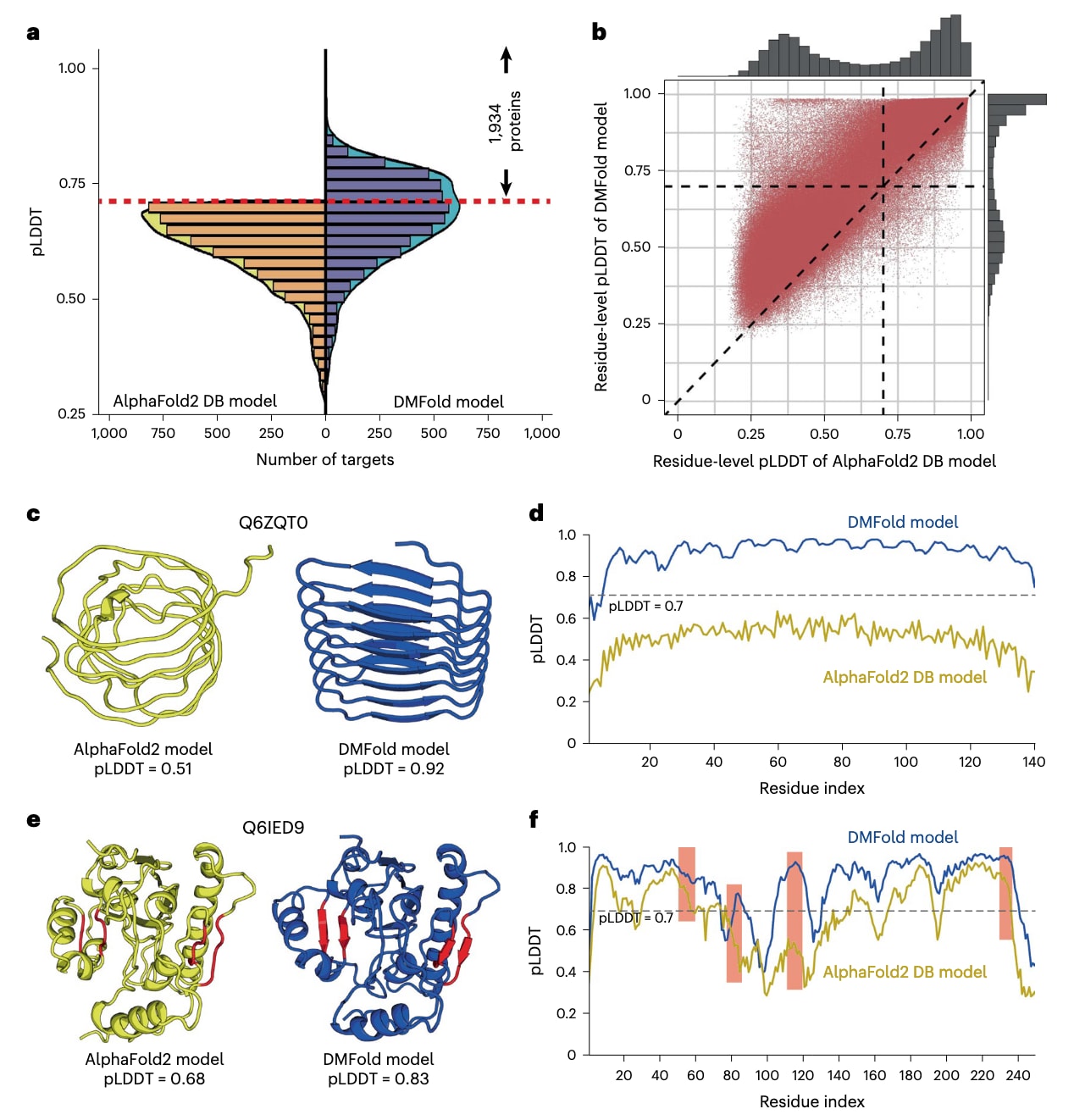 图4 | DMFold在人类蛋白质组5,042个困难目标上的结构建模结果。 a,针对AlphaFold2结构数据库中pLDDT < 0.70的5,042个目标,比较DMFold模型与AlphaFold2 DB模型的pLDDT分布。红色虚线表示置信预测阈值pLDDT = 0.70,其中DMFold在1,934个目标上获得了pLDDT ≥ 0.7。b,对这1,934个由DMFold高置信建模的人类蛋白进行残基级pLDDT逐一比较,共涉及878,094个残基。c,推测的未表征蛋白FLJ45035(Q6ZQT0)的结构模型对比,AlphaFold2 DB模型以黄色表示,DMFold模型以蓝色表示。d,Q6ZQT0在AlphaFold2 DB(黄色)与DMFold(蓝色)下的残基级pLDDT曲线。e,推测的二酰甘油O-酰基转移酶2样蛋白(Q6IED9)的结构模型对比,AlphaFold2 DB模型以黄色表示,DMFold模型以蓝色表示,其中由DMFold构建的两个更加完善的β折叠二级结构以红色标出。f,Q6IED9在AlphaFold2 DB(黄色)与DMFold(蓝色)下的残基级pLDDT曲线,其中与四条β链对应的pLDDT区域以红色背景标注。