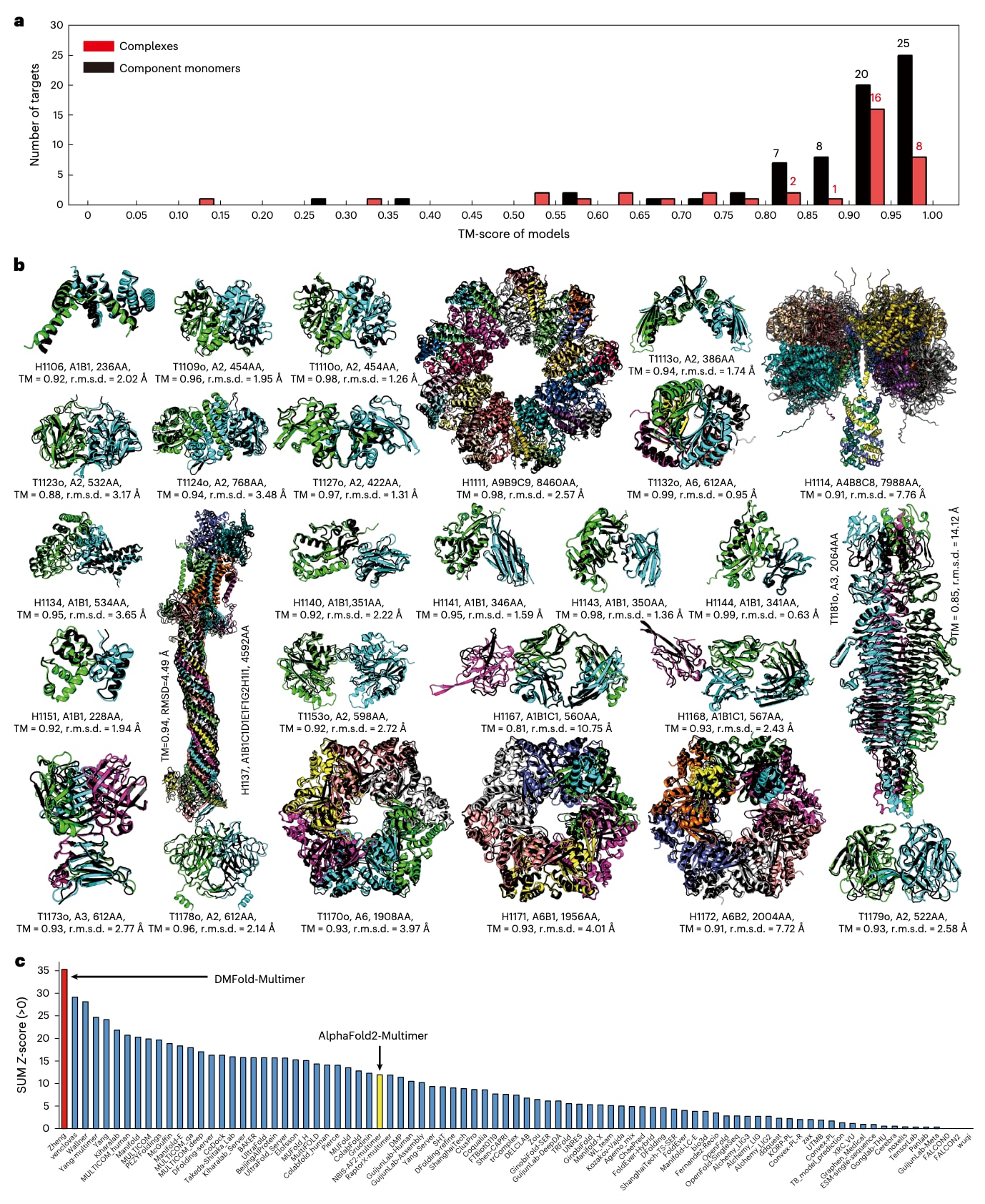 图6 | DMFold/DMFold-Multimer流程在CASP15实验中用于蛋白复合物结构预测的整体表现。 a,在38个已公布实验结构的复合物目标上,DMFold-Multimer预测模型的TM-score分布直方图。b,对27个TM-score(TM) >0.8的复合物目标,展示DMFold-Multimer生成的首个模型与实验解析结构的叠合结果,其中预测模型的各组成单体以不同颜色表示,实验结构以黑色标注。c,基于CASP15官网数据,比较87个参赛装配组在41个多聚体目标上的Z-score总和,其中DMFold-Multimer(注册名Zheng)以红色标出,AlphaFold2-Multimer公共服务器2022年3月版(注册名NBIS-AF2-multimer)以黄色标出。r.m.s.d.表示均方根偏差。