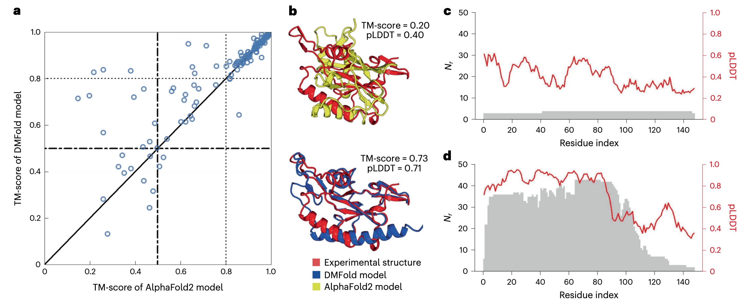 图3 | DMFold在蛋白单体结构域上的预测性能与AlphaFold2的基准对比。 a,在来自CASP13、CASP14和CASP15的132个自由建模(FM)单体结构域上,DMFold与AlphaFold2预测结果的TM-score逐一对比。b–d,以FM结构域T1043-D1为案例,展示AlphaFold2与DMFold生成的结构模型(b),以及基于AlphaFold2所用MSA(c)和DeepMSA2所用MSA(d)时,沿蛋白序列分布的每个位点比对残基数Nr(灰色)与pLDDT评分(红色)。