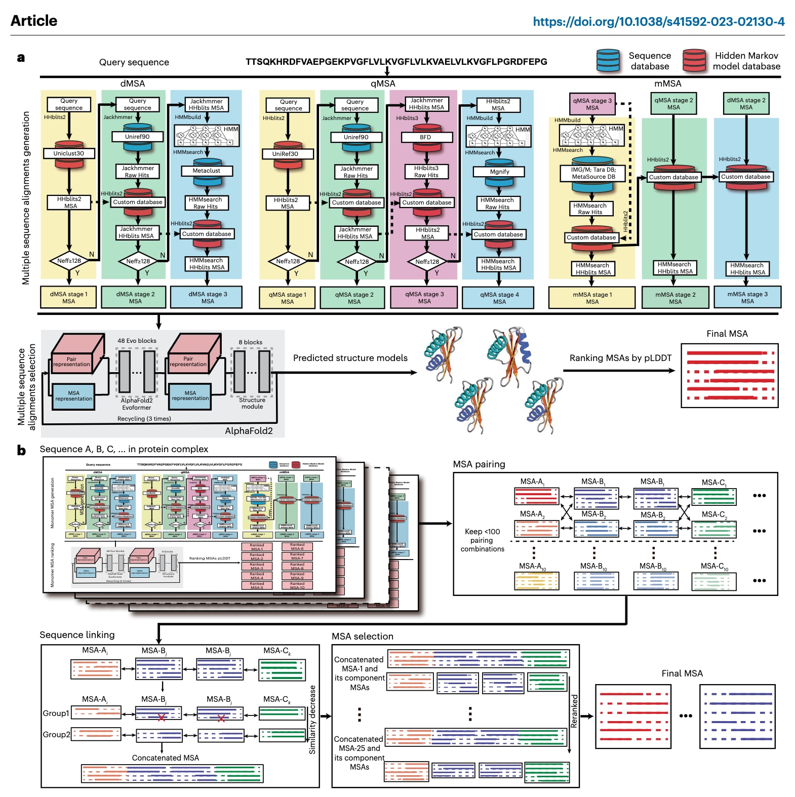 图1|DeepMSA2用于单体与多聚体MSA构建的流程示意图。 a,DeepMSA2-Monomer包含两个主要步骤:首先是迭代式MSA生成步骤,该步骤融合了dMSA、qMSA和mMSA三种算法,随后基于预测结构模型的置信度评分,利用深度学习方法对候选MSA进行排序与筛选。b,DeepMSA2-Multimer包含四个步骤,依次为单体MSA生成、MSA配对、序列连接以及拼接MSA的选择。IMG/M表示来源于Joint Genome Institute的宏基因组数据库,具体说明见Methods中JGIclust部分。