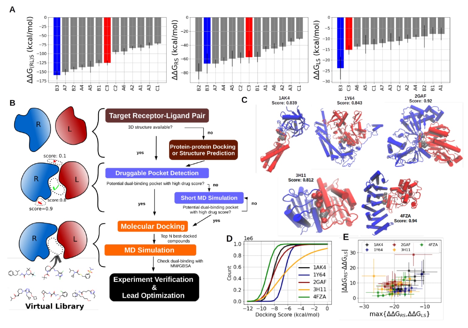 在这些候选口袋中选择了5个具有较高drug score的界面口袋用于虚拟筛选,分别来自PDBID 1AK4、1Y64、2GAF、3H11和4FZA(图5C)。随后从ZINC20数据库中选择100万种化合物,对这些界面口袋进行分子对接(方法见Methods)。结果表明,除drug score最低的口袋(PDBID 3H11,score=0.812)外,其余口袋均能够容纳超过75%的筛选化合物,并获得优于−6 kcal/mol的对接得分,说明基于drug score预筛选的口袋具有良好的成药潜力(图5D)。