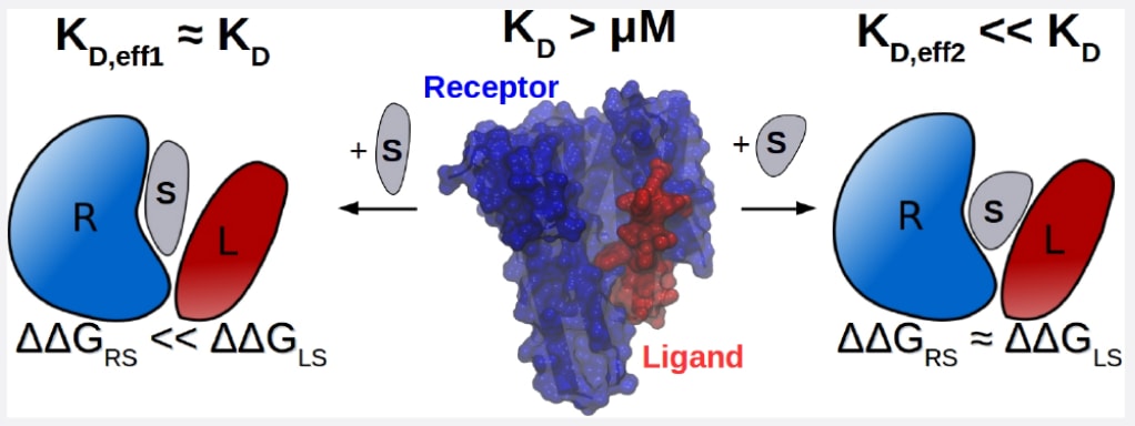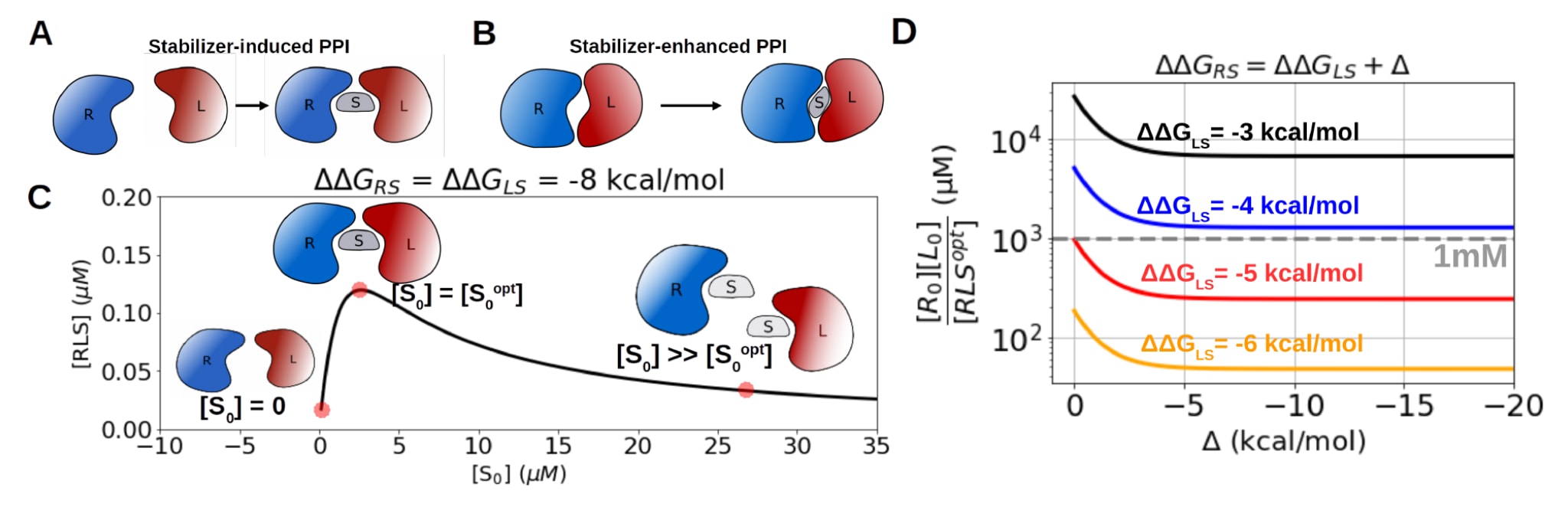 图1|双重结合机制的理论模型。 (A) 稳定剂诱导型PPI示意图。在该情形中,两个原本不相互作用或仅弱相互作用的蛋白质R和L在稳定剂S存在时形成稳定复合物。(B) 稳定剂增强型PPI示意图。在该情形中,本身已经形成的RL复合物在稳定剂S存在时相互作用得到增强。(C) 根据式(1)建立的理论模型示意图。设