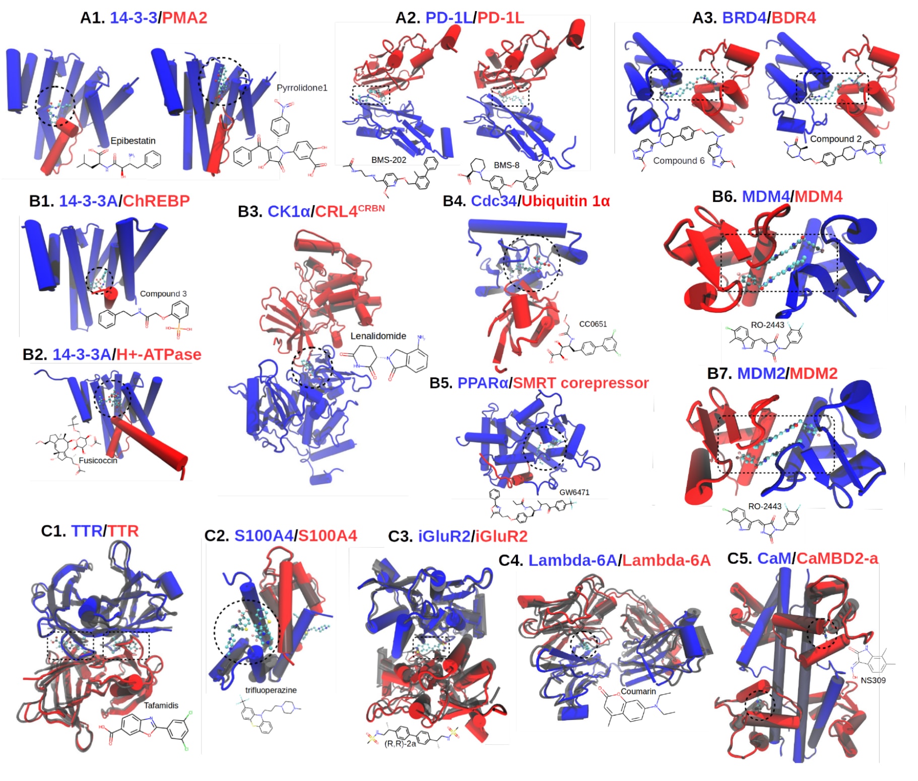 图2|该研究分析的RLS三元复合物的三维结构。 受体蛋白与配体蛋白分别以蓝色和红色表示。对应的PDB编号列于表1。稳定剂的位置以黑色虚线圈出。数据集A(第一行)包含6个RLS复合物,这些体系具有相同的RL蛋白伙伴,并分别与更强稳定剂(左)和较弱稳定剂(右)结合。数据集B(中间各行)包含7个仅具有稳定剂复合物结构、但缺少RL复合物结构的RLS体系。数据集C(最后一行)包含5个同时具有RLS复合物结构以及RL复合物三维结构的体系,其中RL复合物以半透明灰色表示。