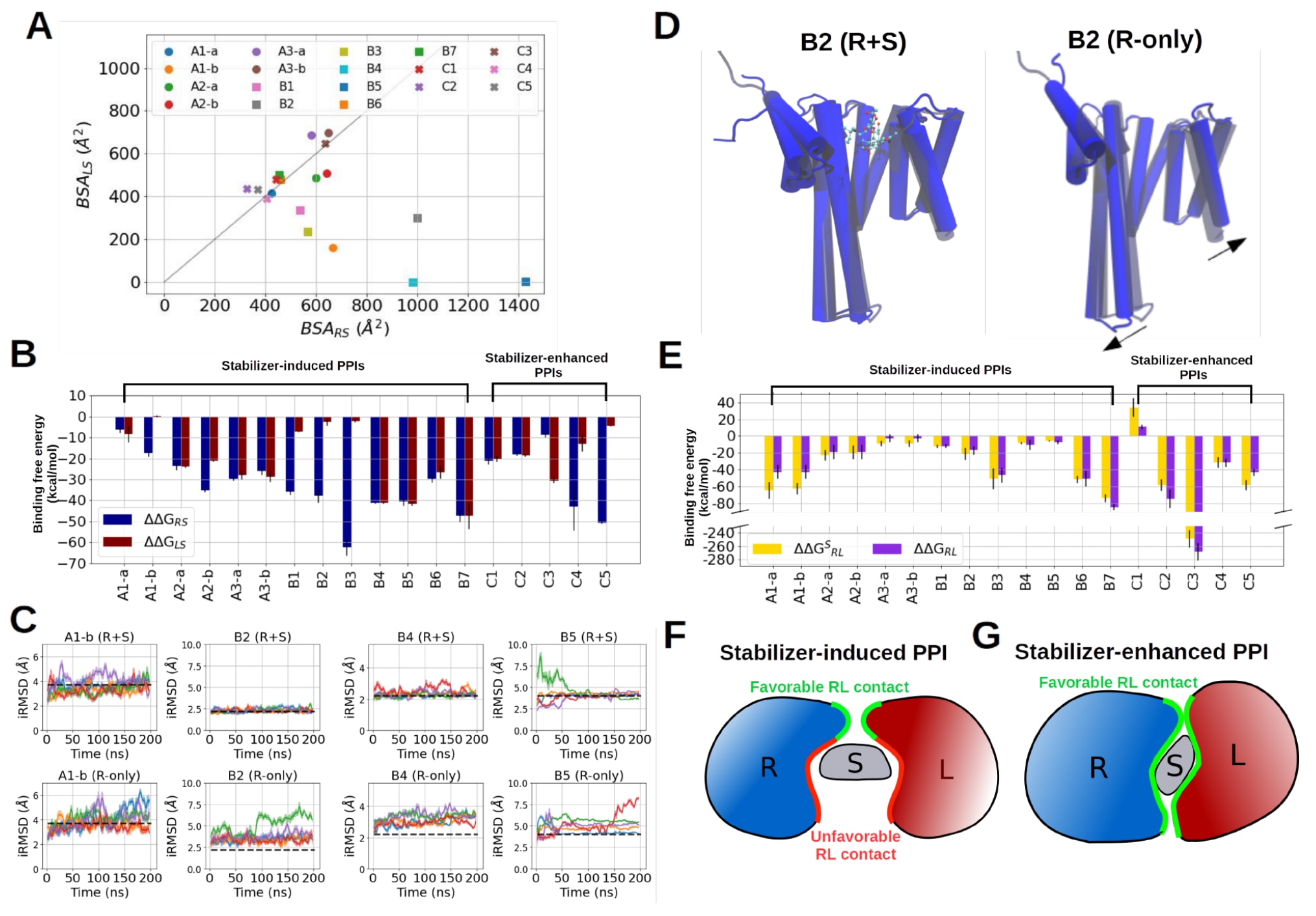 图3|基于MD模拟的结合自由能与界面稳定性分析。 (A) 表1所列RLS晶体结构中,配体与稳定剂之间的埋藏表面积