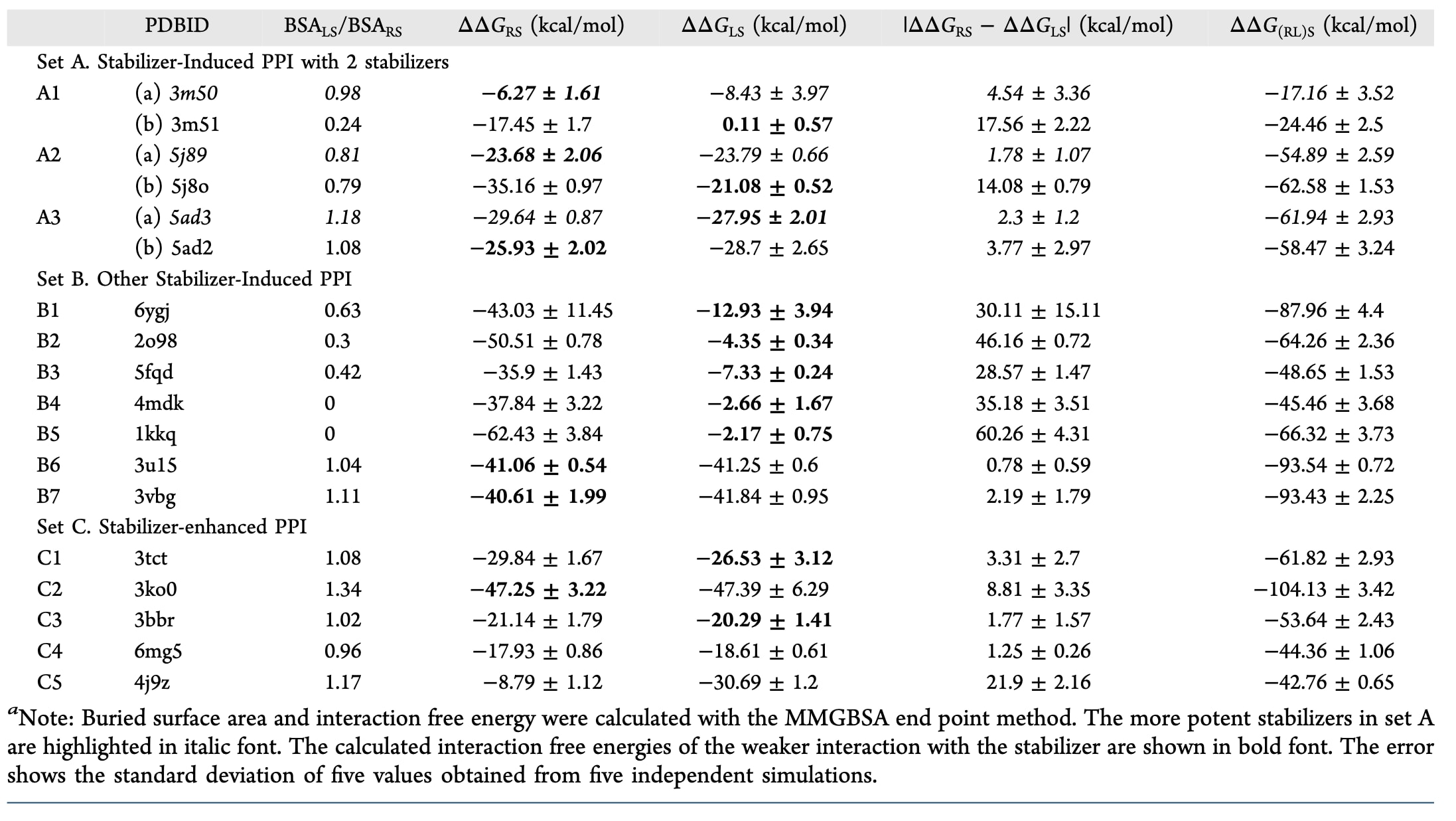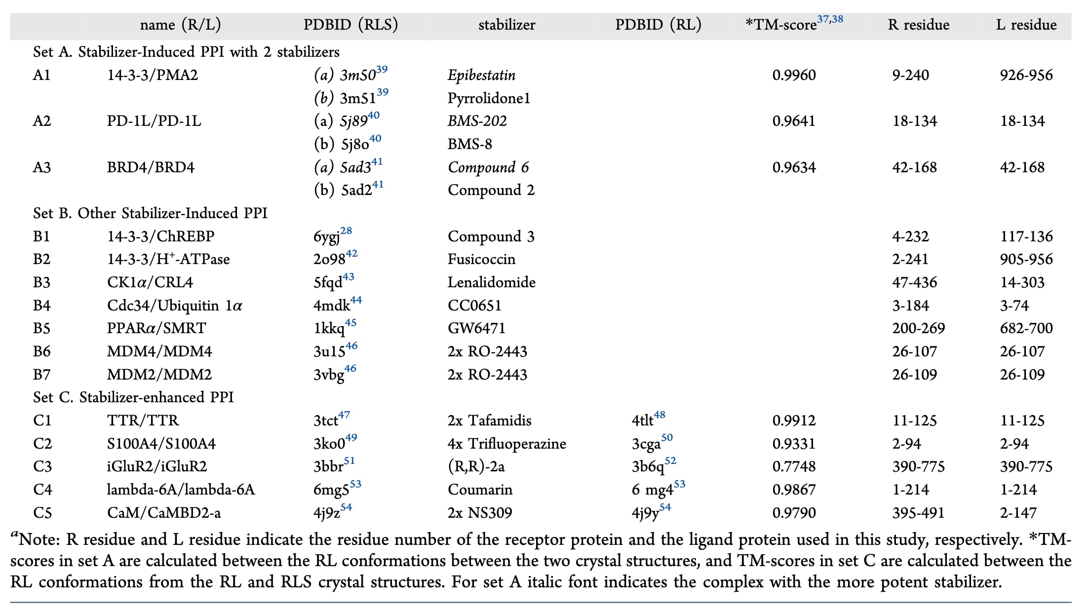 具有三维结构信息的15个PPI体系被划分为三个数据集。数据集A包含3个稳定剂诱导型PPI,其中同一R−L蛋白对受到两种不同稳定剂的稳定作用,并且实验上测定了稳定效果并获得了共晶结构。该数据集用于研究实验测得的稳定效率与RLS复合物的结构、动力学及热力学性质之间的关系。数据集B包含另外7个稳定剂诱导型PPI(每个体系只有一种稳定剂的复合物结构),以及来自数据集C的5个稳定剂增强型PPI(这些体系同时具有无稳定剂情况下的三维结构)。
