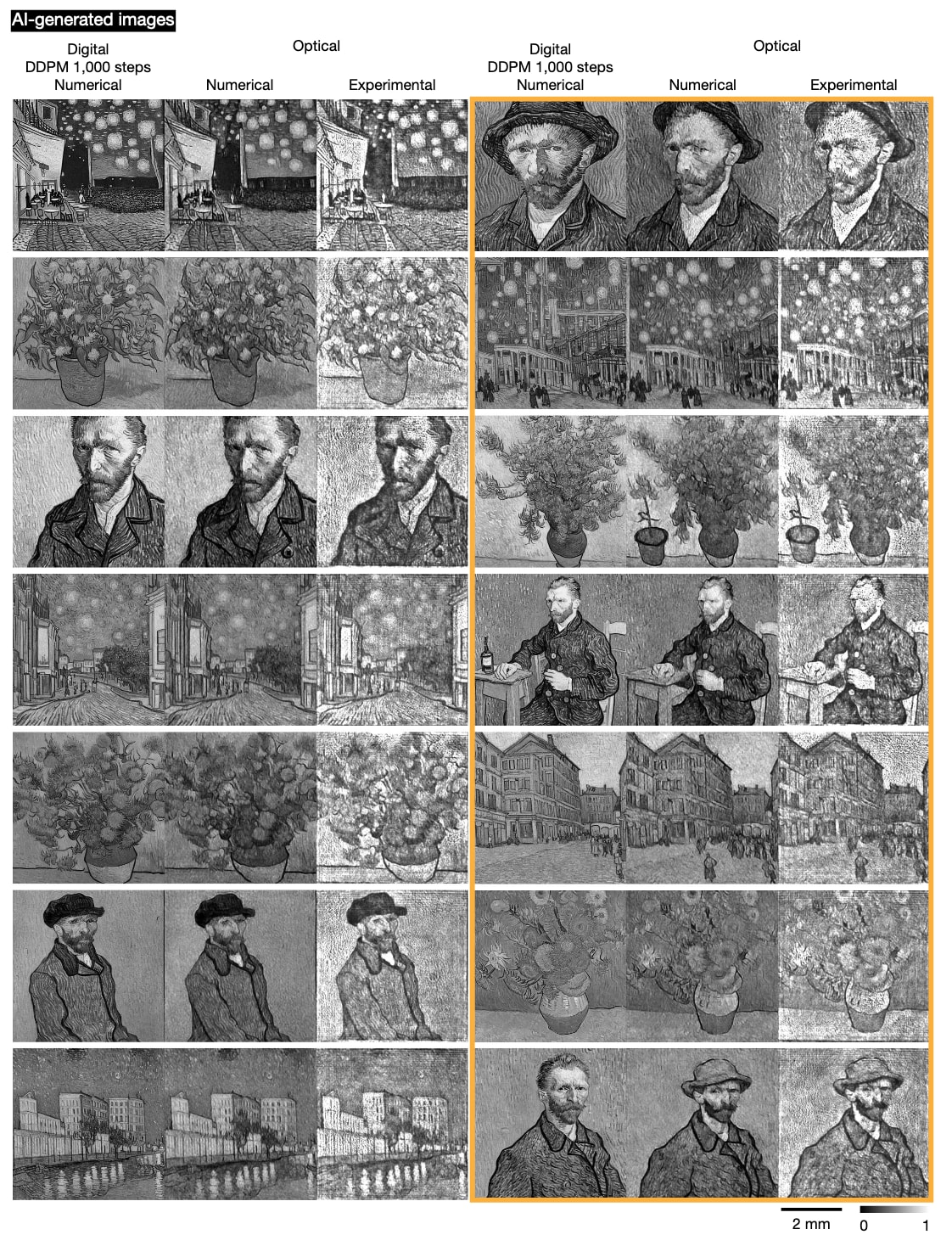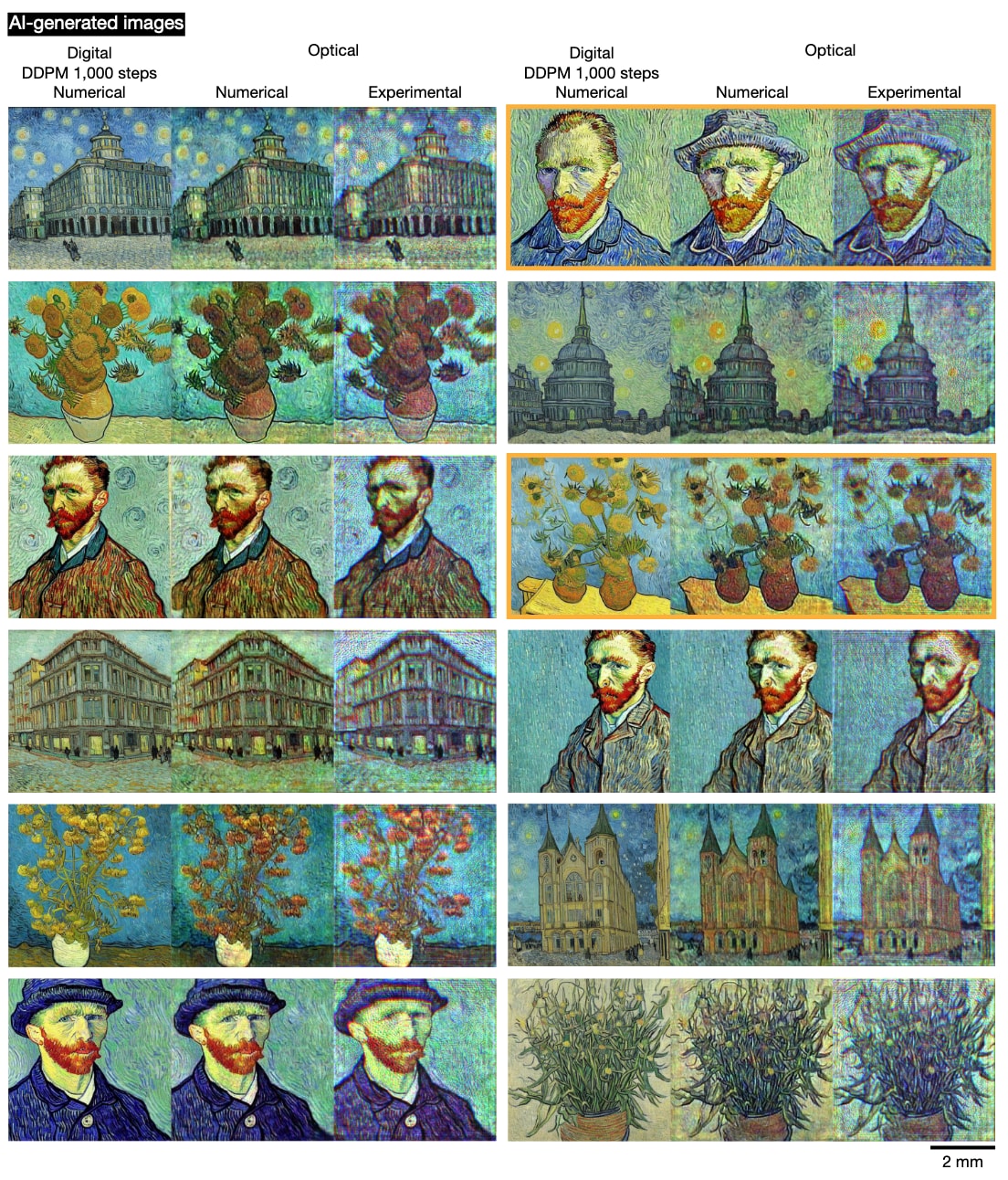 在实验验证中,利用可见光成功生成了手写数字和时尚产品的图像。此外,在单色光与多波长光照明条件下生成了具有梵高风格的艺术作品。这类光学生成模型为实现高能效、可扩展的推理任务提供了新的方向,并进一步展示了光学与光子学在人工智能生成内容领域中的潜在应用价值。