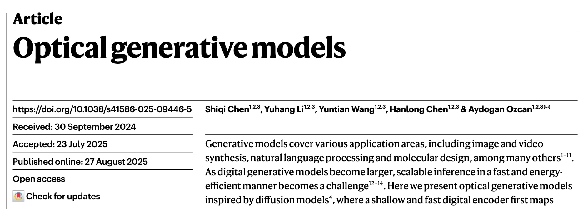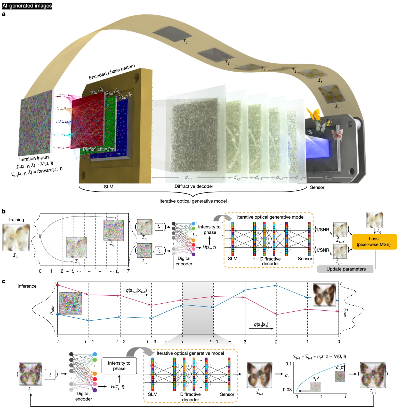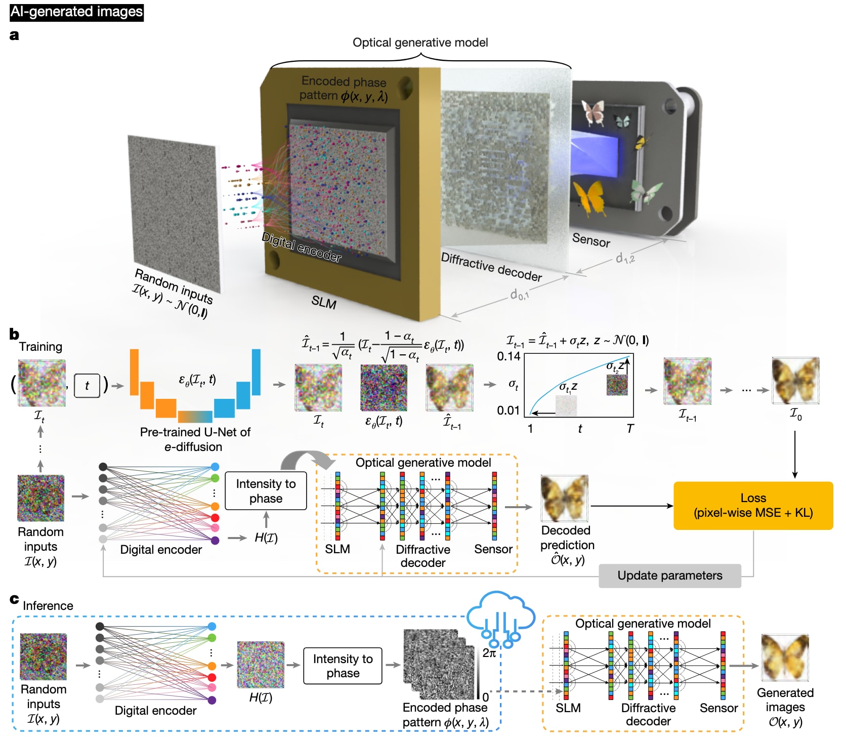 生成式人工智能在图像合成、自然语言处理和分子设计等领域展现出强大能力,但不断扩大的模型规模也带来了能耗和计算成本的挑战。近期发表在Nature的一项研究提出一种新的思路——利用光学系统实现生成式模型。该工作将扩散模型思想与衍射光学计算相结合,通过浅层数字编码器将随机噪声映射为相位模式,并将其作为光学生成种子输入到衍射解码器中,利用光在自由空间传播完成图像生成。与传统数字模型不同,图像合成的核心计算由光学传播完成,在推理阶段几乎不需要额外计算资源。