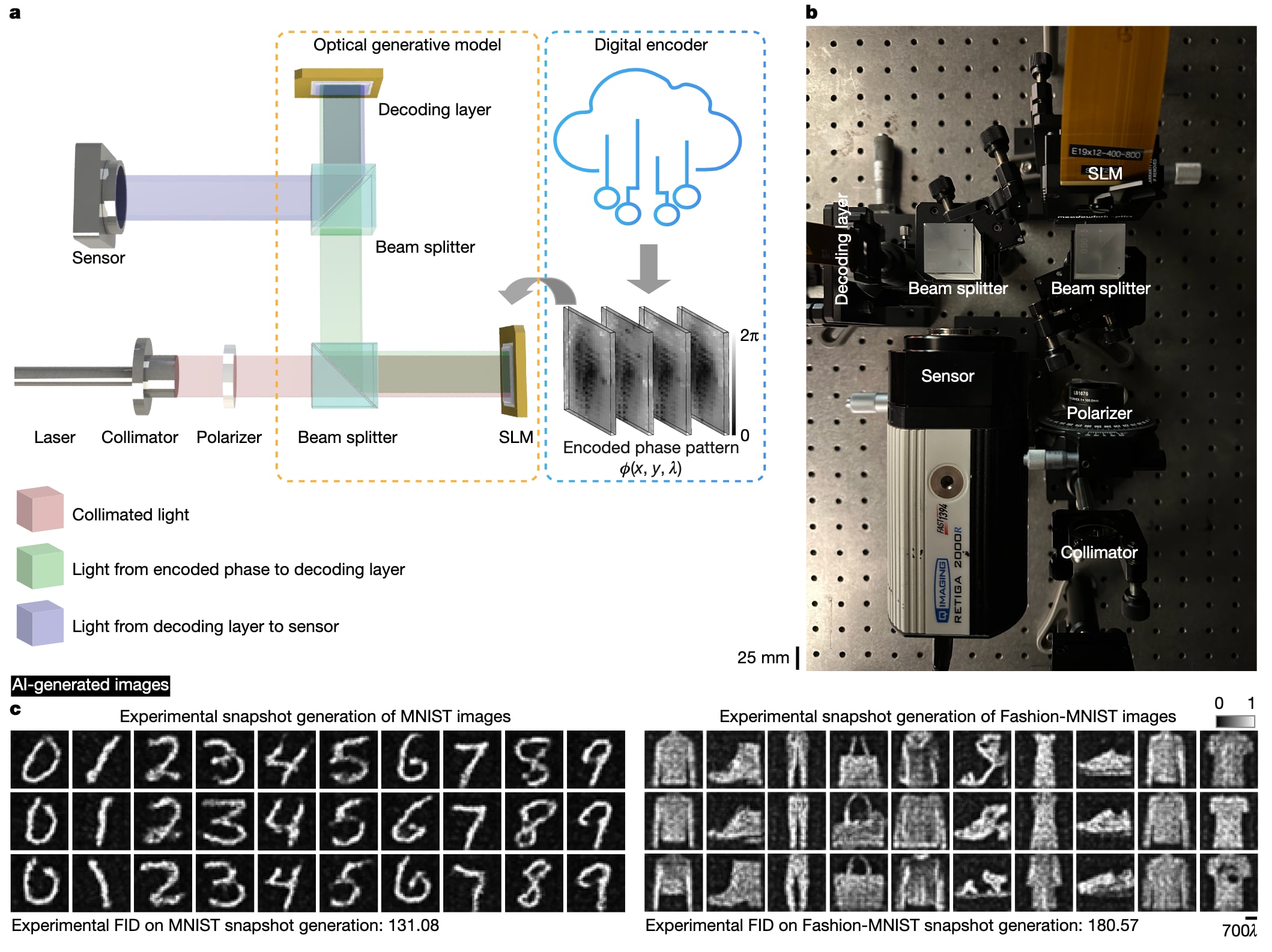 图3|快照式光学生成模型的实验验证。 a, 实验中使用的快照式光学生成模型结构示意。相位编码图案即光学生成种子在推理之前被预先计算完成,并在每次图像生成任务中随机访问使用。b, 快照式光学生成模型的实验装置实物照片。c, 该图中的图像由人工智能生成。展示了利用光学生成模型生成手写数字与时尚产品图像的实验结果,对应的目标数据分布分别为MNIST与Fashion-MNIST数据集。图中同时给出了归一化强度的颜色条以及尺度标尺,并展示了与原始数据集比较得到的实验FID评估结果。