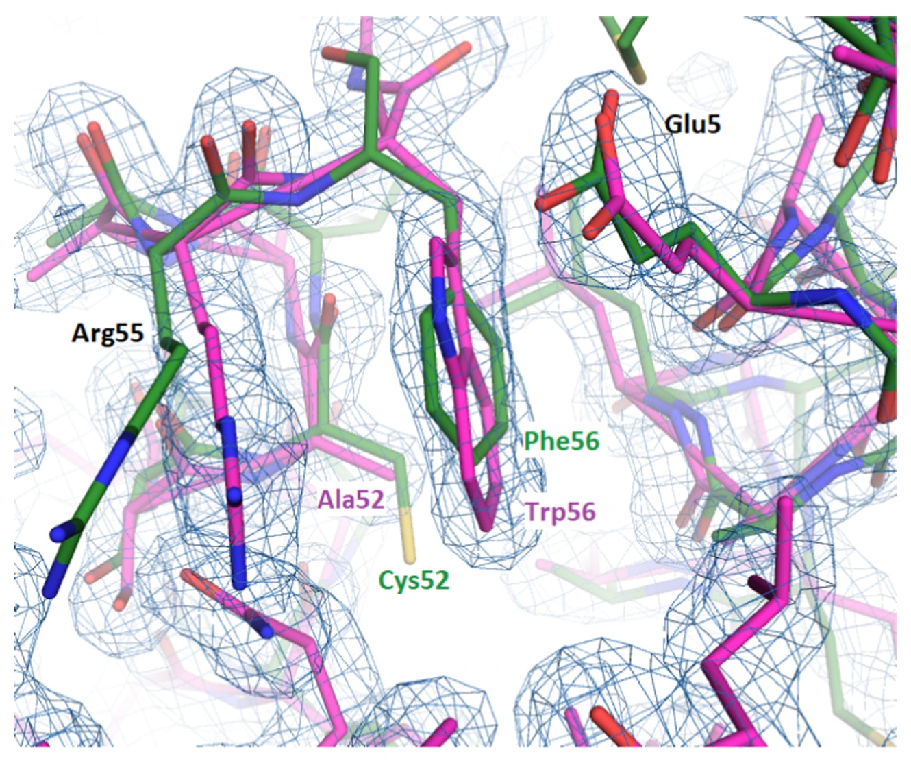 图5|展示了Phe56被Trp替换后的结构特征。 图中以洋红色显示7KAE结构中引入的色氨酸及其周围区域,野生型结构以绿色叠加显示。同时给出了7KAE的电子密度图,等高线水平为1.8σ。相邻的Cys52到Ala的突变用于补偿色氨酸体积增大所带来的空间占据变化。