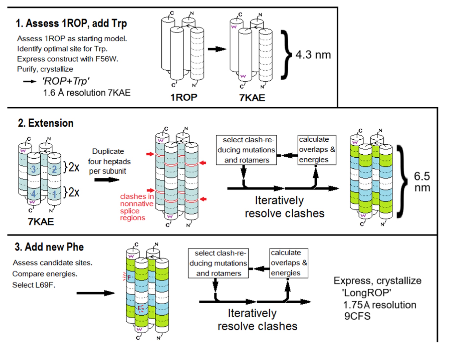 图2概述了整体的工程化设计流程,该流程由三个连续步骤组成。每一个步骤均在设计标准的约束下,反复结合pymol、molprobity和rosetta等工具,对候选突变进行建模与分析,以确保结构合理性与稳定性。在第一步中,选择野生型结构1ROP作为起始模型,在对称二聚体的蛋白核心中引入一个色氨酸残基,使每个二聚体包含两个色氨酸。该构建体随后进行表达并成功结晶,获得了晶体结构pdb:7KAE。第二步为蛋白长度的实际延展设计,该过程在计算机模拟中完成,通过七肽重复复制对结构7KAE进行延长。在此过程中,持续进行序列与结构的迭代优化,以消除原子间的空间冲突并缓解不利的相互作用。第三步在已延长的蛋白结构基础上进一步引入一个苯丙氨酸残基,并配合额外的序列精修。最终获得的蛋白被成功表达并结晶,其晶体结构解析为pdb:9CFS。