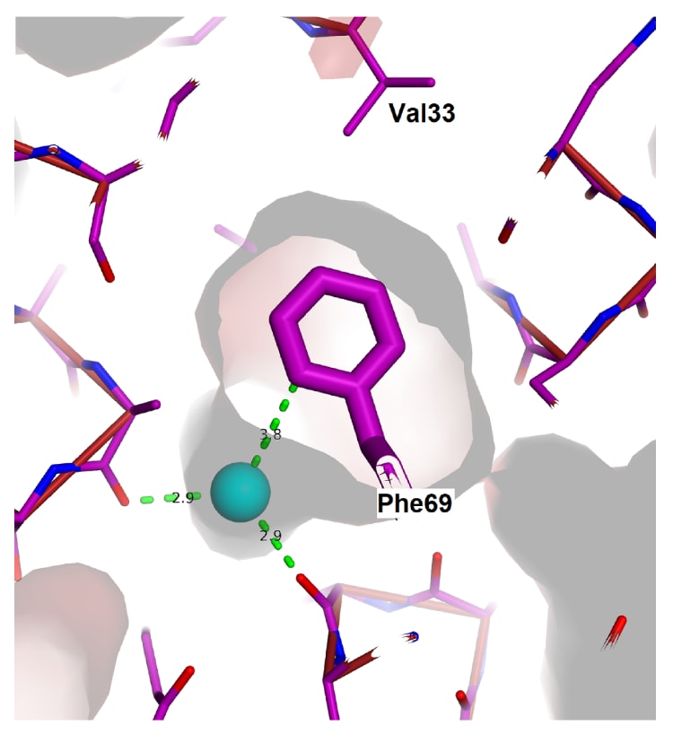 图7b|展示了Phe69及其相邻的核心水分子。 周围蛋白的范德华表面显示,该苯基与局部结构之间形成了紧密贴合。苯环附近唯一存在的空腔由一个水分子占据,该水分子位点在1ROP结构中同样可以观察到,即使当时尚未引入苯丙氨酸。这一现象表明,Phe69的引入并未对蛋白核心结构造成扰动。