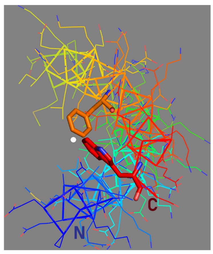 图6|展示了沿分子轴方向观察的延长ROP中一条多肽链的投影图。 碳原子按照序列位置由蓝色渐变至红色着色,显示每条螺旋在螺旋束的超螺旋结构中绕中心轴旋转约120°,且这种旋转沿整个螺旋束长度连续而平滑。图中特别强调了两个新引入的芳香族残基Phe69和Trp84,白色圆圈标示分子轴的位置。尽管在该投影视角下苯丙氨酸与色氨酸看起来彼此接近,但实际上二者之间的距离约为1.5nm,约占整个螺旋束总长度的三分之一。在该视图中,多肽链的N端和C端位于观察者近端,而位于序列中部的环区则以黄绿色显示,位于远端。