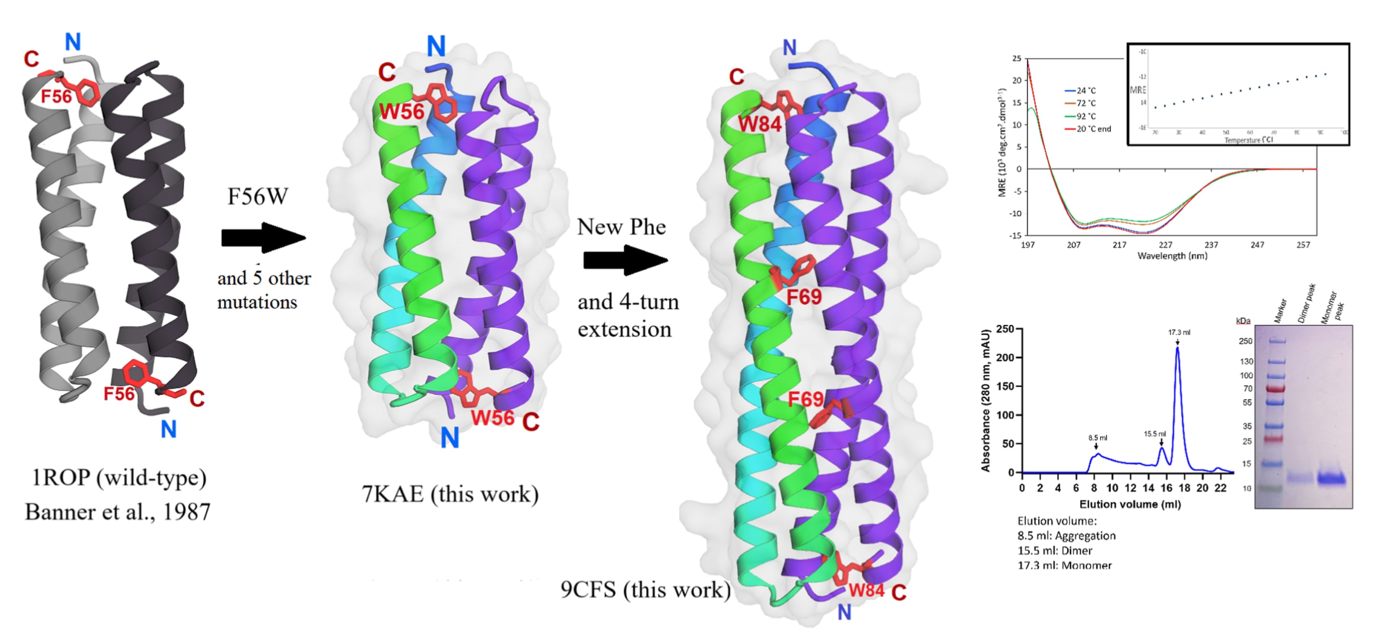 图1|图形化总结。 该图概述了在构建7KAE和9CFS过程中所采用的整体结构改造策略。图右侧展示了相应的生物物理表征结果,其中右上角的圆二色谱结果表明,9CFS蛋白具有明显的α螺旋构象,并在升温至92°C时仍保持稳定,其热变性过程具有可逆性。右下角给出了体积排阻色谱和SDS-PAGE分析结果,显示样品具有较高纯度。用于结构解析的晶体来源于体积排阻色谱中主要洗脱峰对应的蛋白组分。