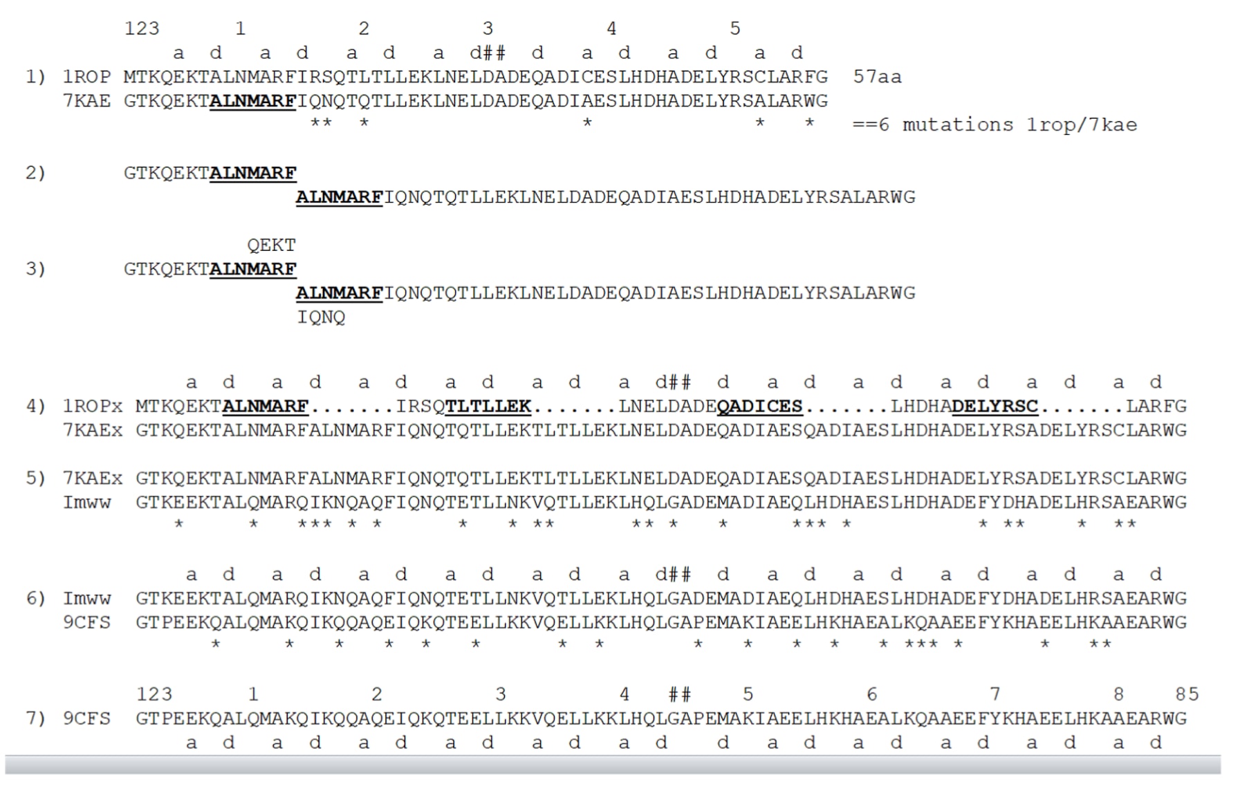 在通过复制一个包含两个螺旋圈的片段实现初步延展后,进一步开展了多轮序列差异化与优化。利用Molprobity识别空间位阻,并结合Pymol在常见旋转异构体范围内评估可能用于缓解冲突的突变。此处所称的“冲突”不仅包括空间位阻,还涵盖静电排斥和疏水性不匹配等能量不利因素。能够完全或部分缓解冲突的突变会被作为候选,并进一步在相邻位点引入新的突变进行评估。所有突变位点汇总见图4。初始阶段,显著的冲突主要集中在相邻重复模块的非天然拼接界面附近,对应于85个残基序列中的第14、34、54和73位区域。随着这些冲突被逐步消除,新的冲突往往在邻近区域出现,使突变区域逐渐向外扩展。通常需要进行10至15轮迭代,才能获得无明显冲突的候选结构,并进一步使用Rosetta进行详细的能量评估。候选方案同时根据亲水性和电荷分布进行筛选。该过程之所以相对高效,得益于ROP蛋白结构的高度简洁性以及已有的高分辨率结构先例。大多数侧链在拓扑上可清晰区分为核心、表面或半埋藏位置,且除表面位点外,其余位置在空间上均受到较强限制。冲突严重程度的评估同时考虑了侧链与主链的键合距离。由于蛋白几乎完全由α螺旋构成,突变设计倾向于选择有利于螺旋形成的残基,其优先级依据螺旋倾向性排序为EMALK > FQWIV > DHRTS > CYNPG。综合考虑螺旋倾向性以及核心与表面位点在疏水性上的差异后,每个位点通常仅剩少数可选残基。多轮迭代最终促成了一些协同补偿突变簇的形成。Rosetta用于对最有前景的候选结构进行能量最小化并比较其能量水平,同时对最初完全相同的重复区域赋予序列差异化的优先权,使蛋白序列逐步演化为全长范围内的唯一序列。