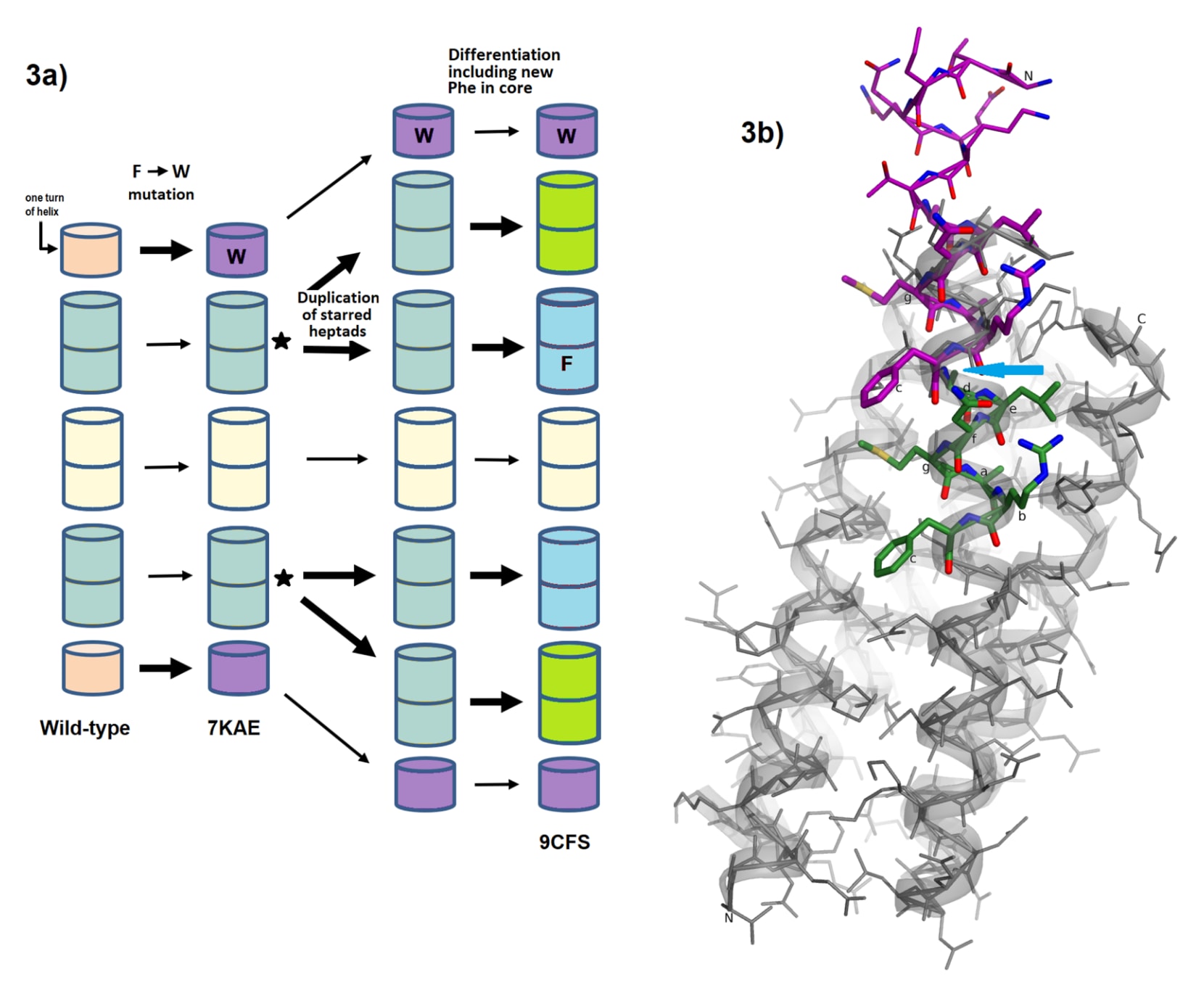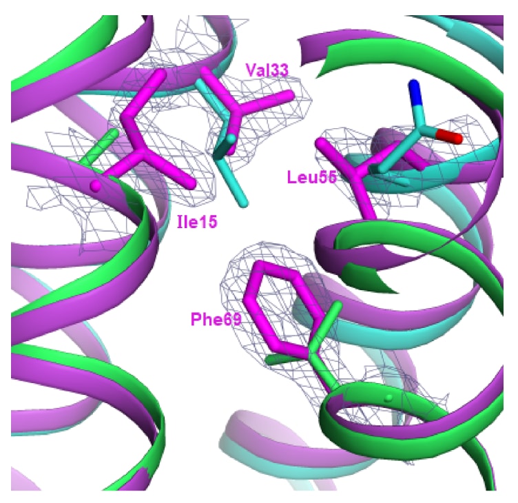 图7a|展示了晶体结构9CFS中围绕新引入苯丙氨酸位点形成的突变簇,该位点位于蛋白核心区域。 Phe69在9CFS中取代了1ROP和7KAE中的Leu48,其体积增大通过相邻位点的补偿性突变得以缓解,从而实现了局部核心结构的重新堆积。为便于观察,图中仅显示了四个突变位点,分别位于四条螺旋上。由于在序列中插入了七肽重复单元,9CFS中的残基编号相较于1ROP和7KAE中对应位置均增加了7的整数倍。图中以洋红色显示9CFS结构,并给出了等高线为1.8σ的电子密度图;7KAE结构则以绿色和青色叠加显示。