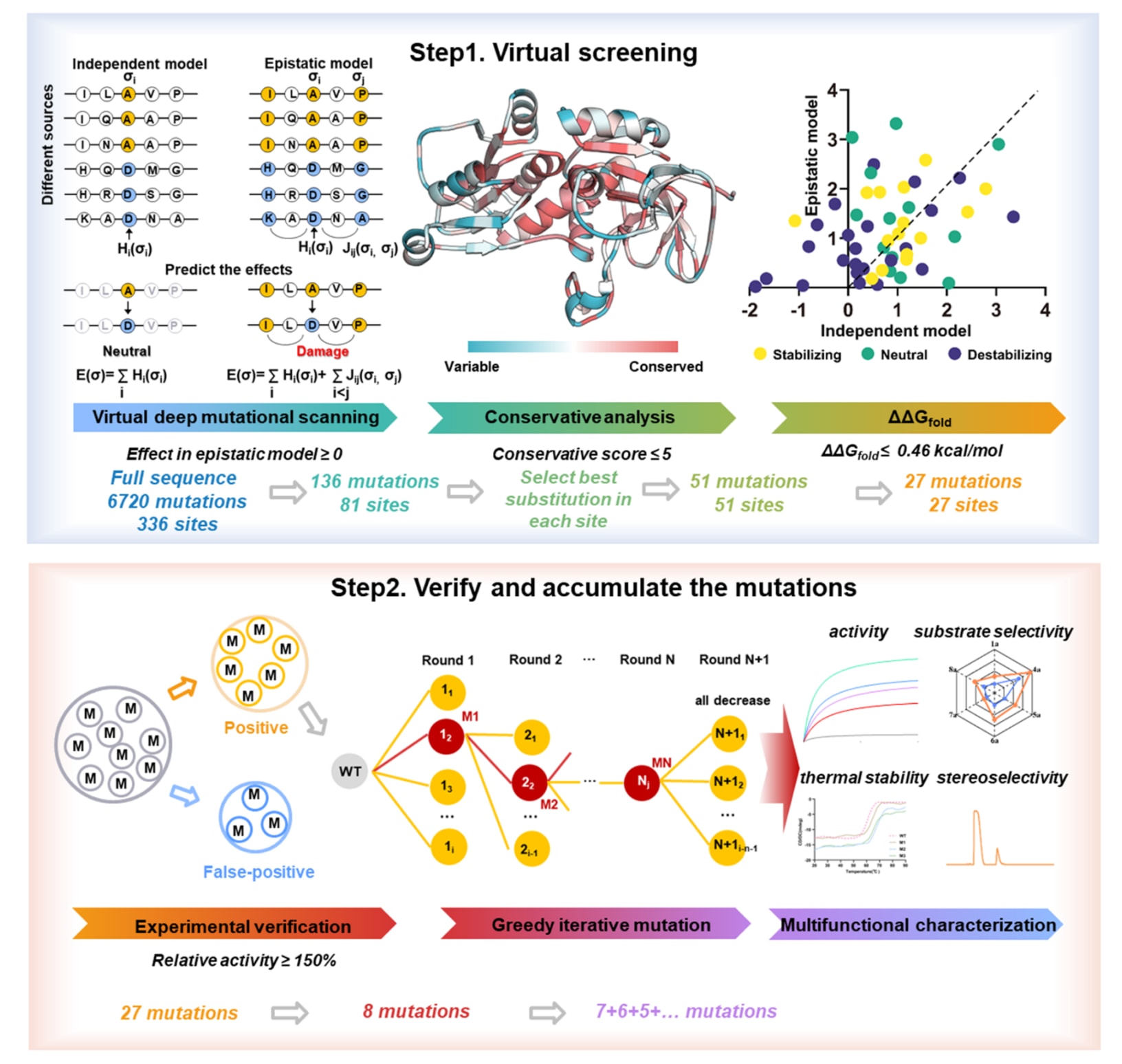 面向催化效率、选择性和稳定性协同进化的功能热点理性设计,并据此系统解析酶的催化机制,是高效合成手性醇过程中一个关键的科学问题。然而,多数蛋白质工程工作仍局限于催化中心的少数关键位点,难以对整个蛋白范围内的功能位点进行全面探索。该研究提出的全局进化策略,通过考虑残基之间的相互依赖关系来预测单点突变的效应。为了提高蛋白对突变的耐受性,研究进一步结合保守性分析和