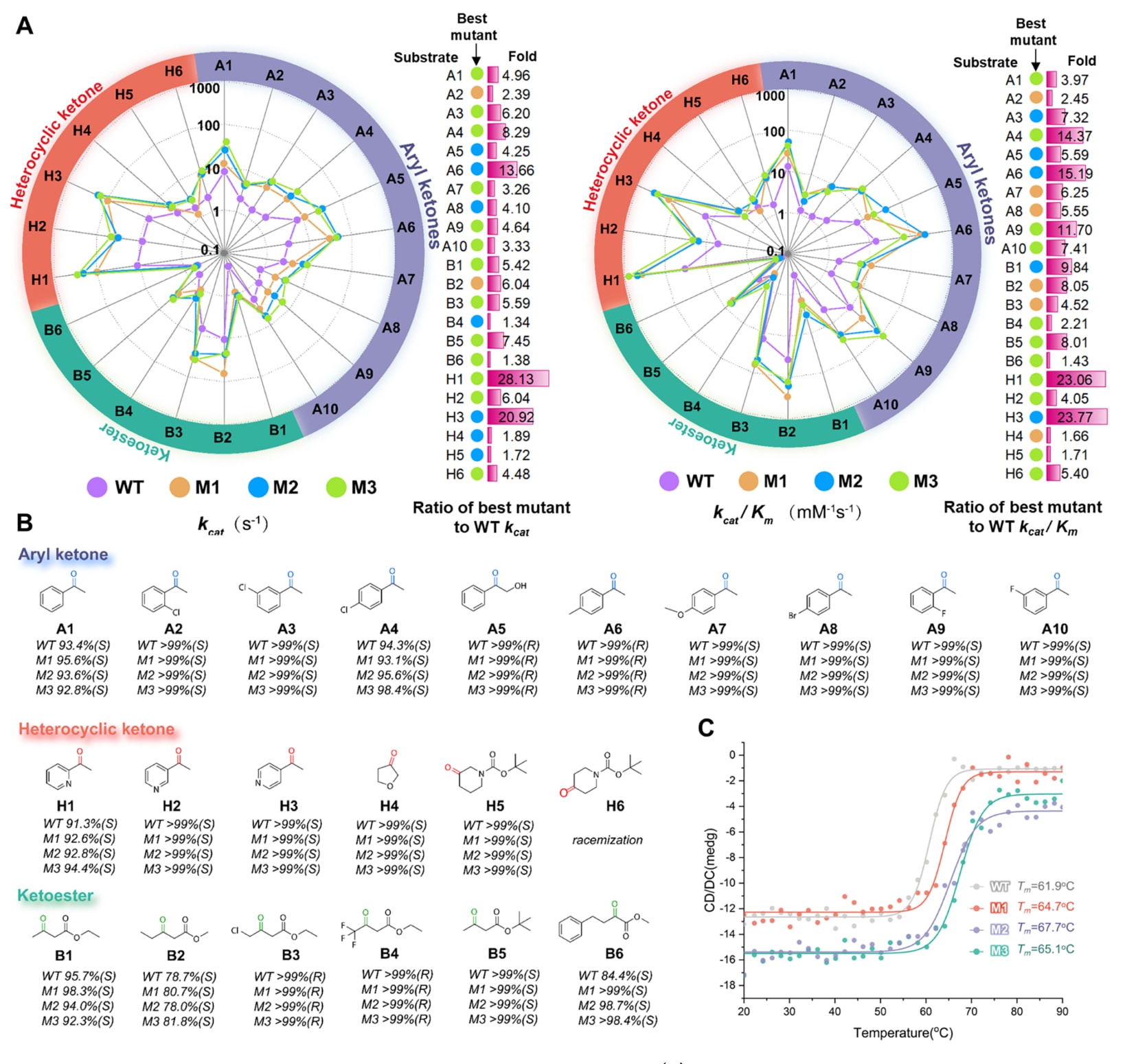 为了评估该策略在多种功能性质,包括活性、立体选择性和热稳定性方面的可行性,研究进一步将所有获得的有益突变体M1至M3纯化至均一状态,并测定了它们针对一系列结构特征差异较大的羰基化合物底物的动力学参数、对映体过量值ee以及