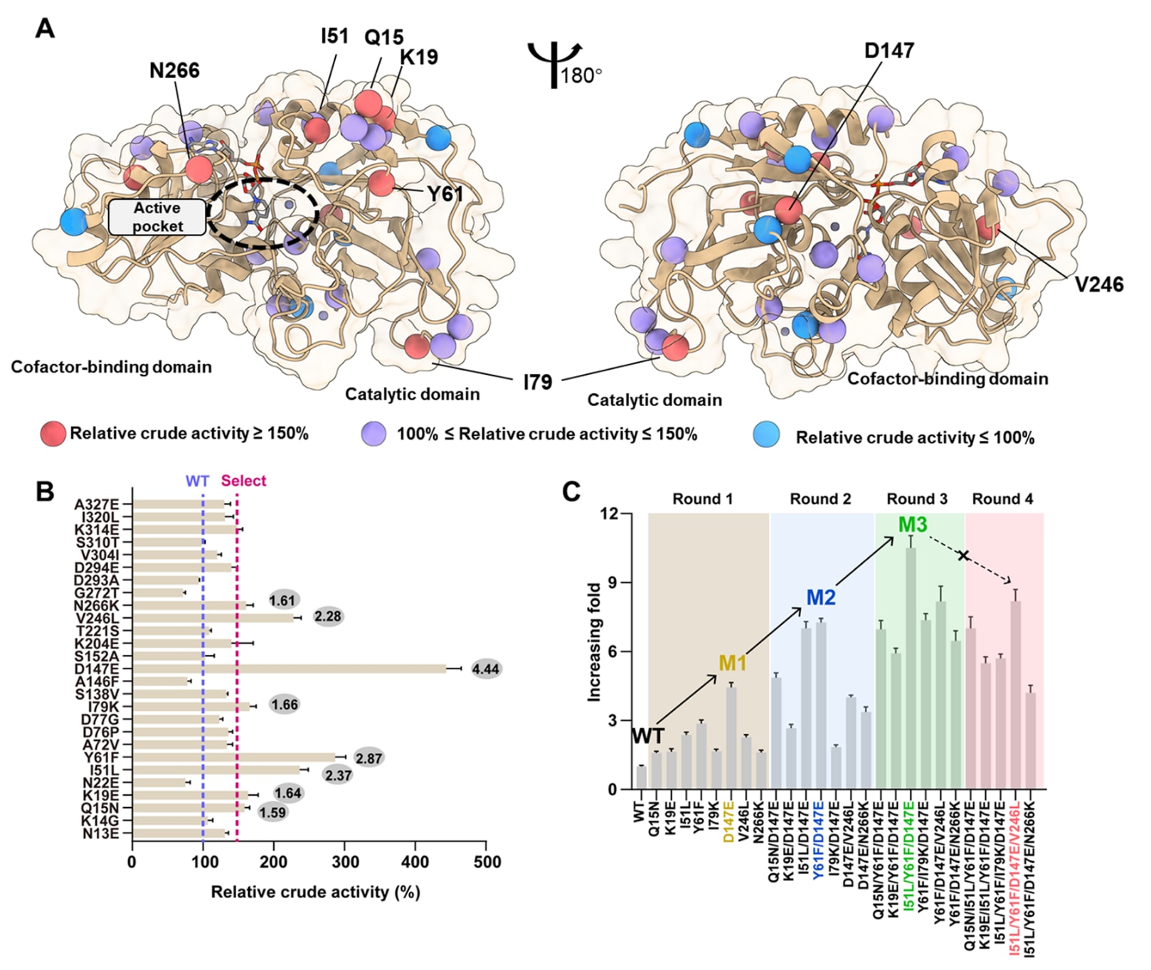 图2|基于全局进化策略、以2-乙酰基吡啶为目标底物的蛋白质工程热点预测。 (A) 通过全序列进化分析预测得到的27个突变热点在蛋白结构中的分布。(B) 对27个热点位点进行筛选扫描。(C) 对正向突变体进行迭代组合突变。
