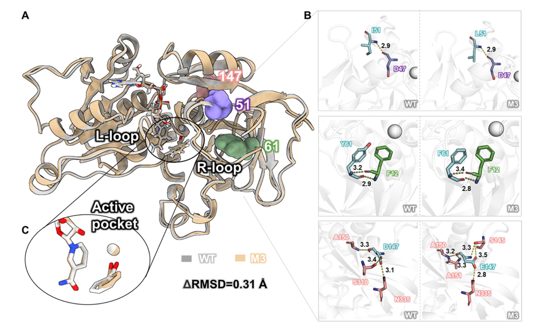 图4|WT与M3结构分析。 (A) WT与M3整体结构比较。WT以灰色表示,M3以棕色表示。(B) 突变位点及其与周围残基相互作用的比较。突变残基与周围残基之间的关键原子间距离,单位为Å,以虚线标示。(C) 活性中心底物结合模式的比较。