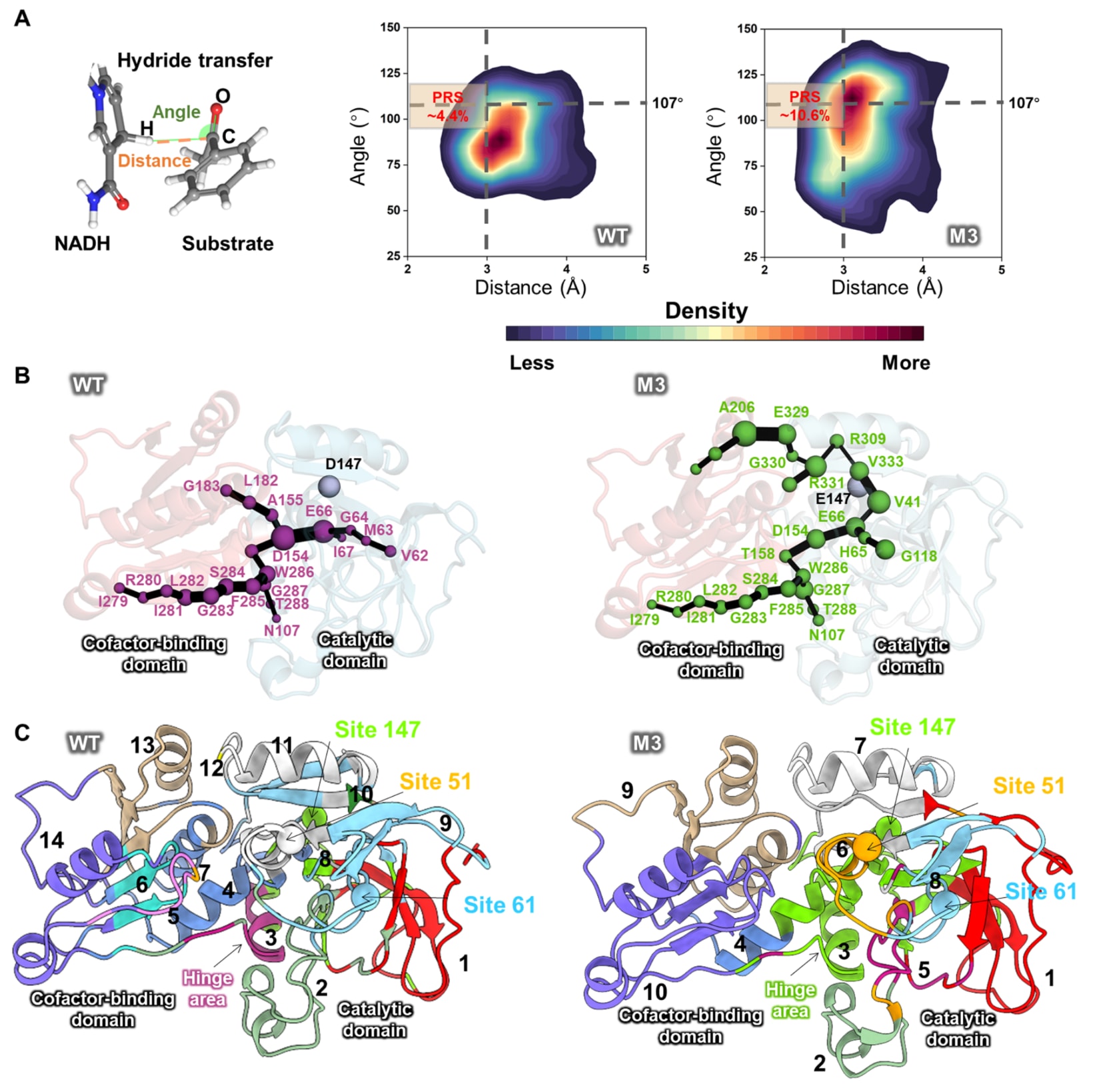 为了更深入理解长程相互作用,研究基于DCCM得到的残基相关矩阵进行了群落分析。该方法能够识别出以协调运动方式变化的残基簇,即“群落”,从而揭示可能参与集体动力学或变构网络的区域。与简单的相关性测量相比,群落分析能够提供更丰富的信息。研究分析了模拟阶段中的群落分布(图5C),发现WT包含14个群落,而突变体仅有9个。这说明与WT中较为分散的相互作用相比,M3表现出更加紧密的通信组织。值得注意的是,147位点突变位于第3群落的核心位置,而WT中的第3、8、9和10群落在M3中合并为单一的第3群落。这几个原始群落分别分布于铰链区、辅酶结合结构域和催化结构域。除此之外,WT中辅酶结合结构域的第8、10、11和13群落在M3中也重新整合为第3和第8群落,使辅酶结合结构域最终只剩下4个群落。与此同时,M3中的第4群落,其中包含61位点,进一步扩展并纳入了在WT中作为独立群落存在的red loop区域。这个red loop位于底物结合口袋入口处,相当于一个“门控”区域,调节底物进入和产物释放。