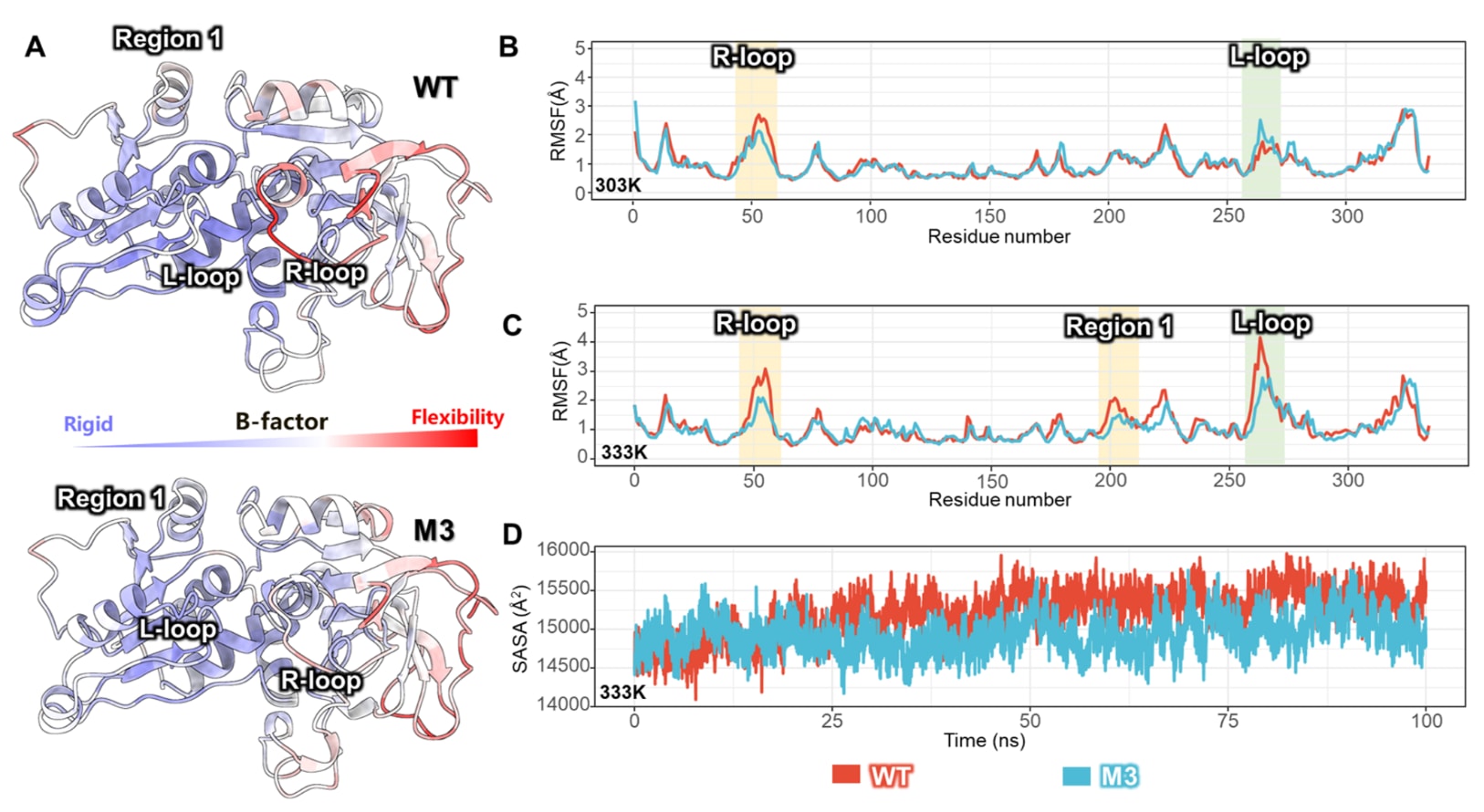 图6|WT与突变体的柔性分析。 (A) WT与M3的B因子分布。(B) 303K条件下WT与M3的RMSF值。(C) 333K条件下WT与M3的RMSF值。(D) 333K条件下WT与M3的SASA值。