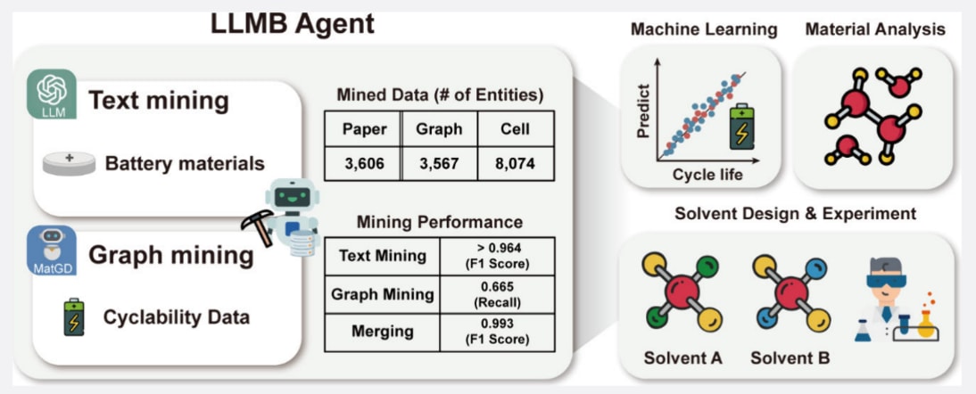 该研究提出了一种新的多模态数据驱动方法,即用于电池研究的大语言模型智能体LLMB,该方法由大语言模型(LLM)和自动图像挖掘工具Material Graph Digitizer(MatGD)组成。该方法以96.4%的准确率自动提取电池材料的综合信息,达到了当前已知的最先进水平,并覆盖了共计29类实体,是目前报道中实体数量最多的一项工作。此外,首次实现了直接从循环曲线图中挖掘循环性能数据。基于这一规模独特且数据丰富的数据集,构建了能够预测电池容量的机器学习模型。这些模型不仅能够预测初始循环和第50次循环的容量,还通过SHapley Additive exPlanations(SHAP)方法提供了关于电解液分子结构与溶剂化结构如何影响循环性能的解释,该方法能够定量识别各化学特征对预测结果的贡献。进一步的实验验证表明,采用弱溶剂化溶剂(如二乙醚)可以提升循环性能,其表现为形成了阴离子衍生的薄SEI层以及具有结晶结构的锂沉积。