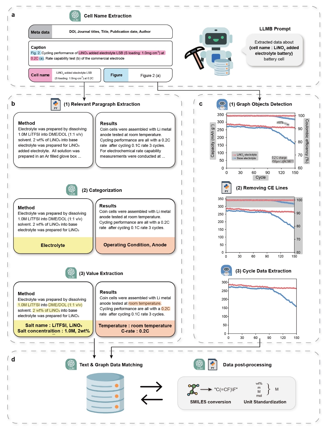 开发了一种基于LLM的自动化人工智能智能体LLMB,可从电池研究论文的文本和图像中提取全面的电池信息,并将其整合为结构化数据库。LLMB智能体通过三个主要阶段运行:(1)文本挖掘,(2)图像挖掘,以及(3)数据库构建。为高效执行这些任务,LLMB采用模块化架构,由多个LLM组成(未进行微调的GPT-4模型),每个模型在整体流程中负责特定任务。
