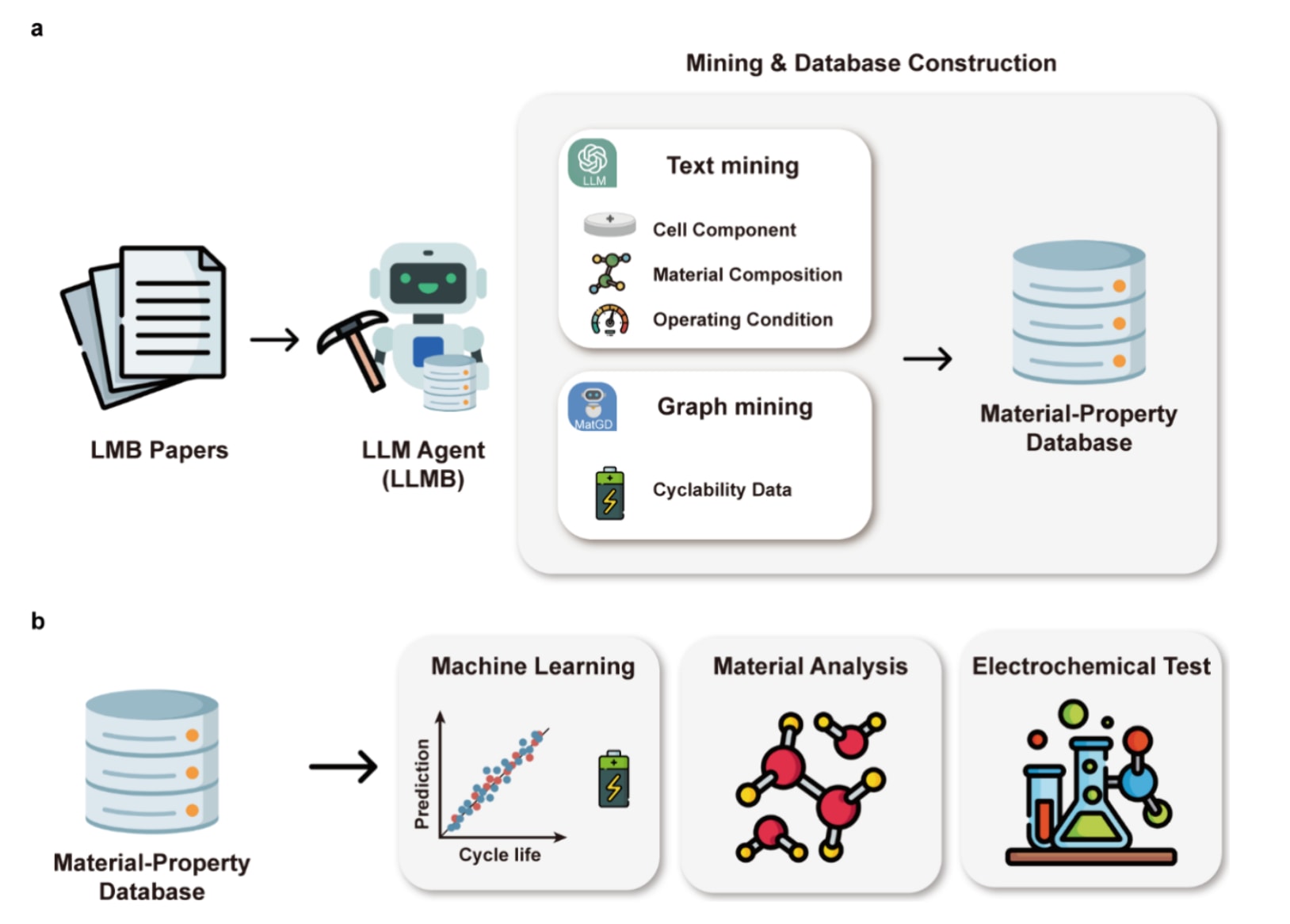 图1|电池科学中机器学习辅助的数据驱动研究方法示意图 a. LLMB 智能体从文献中自动提取文本和图结构数据。各阶段收集与电池材料及性能相关的信息,包括电池组成、材料成分、操作条件以及循环性能。 b. 构建的数据库用于机器学习、分子模拟与材料分析。