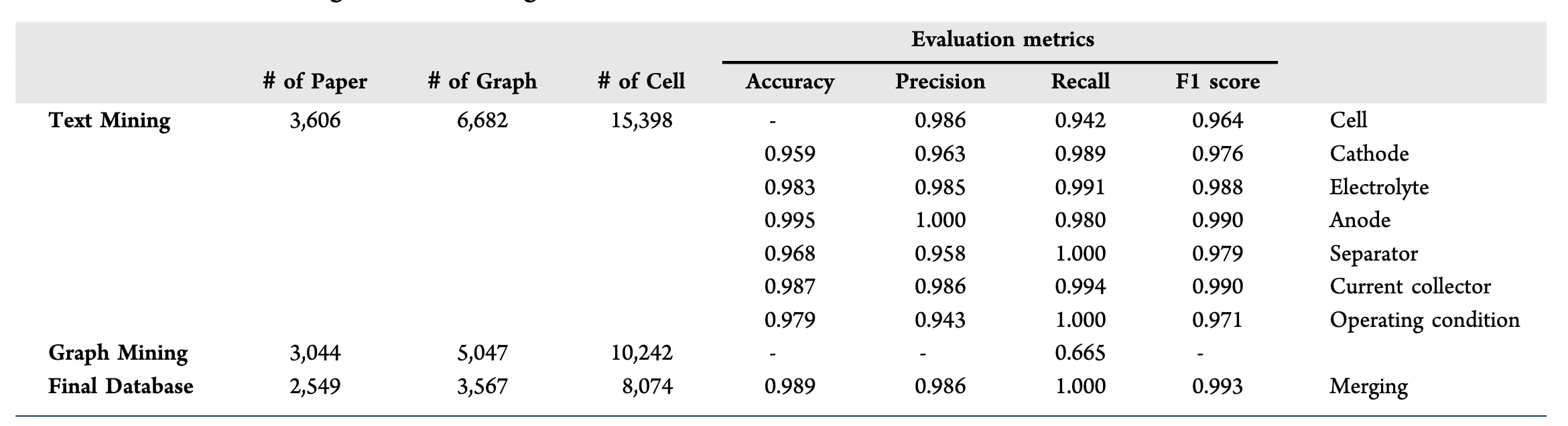 表1|提取的论文、图像和电池数量汇总,以及挖掘过程各阶段的准确率、精确率、召回率和 F1 分数