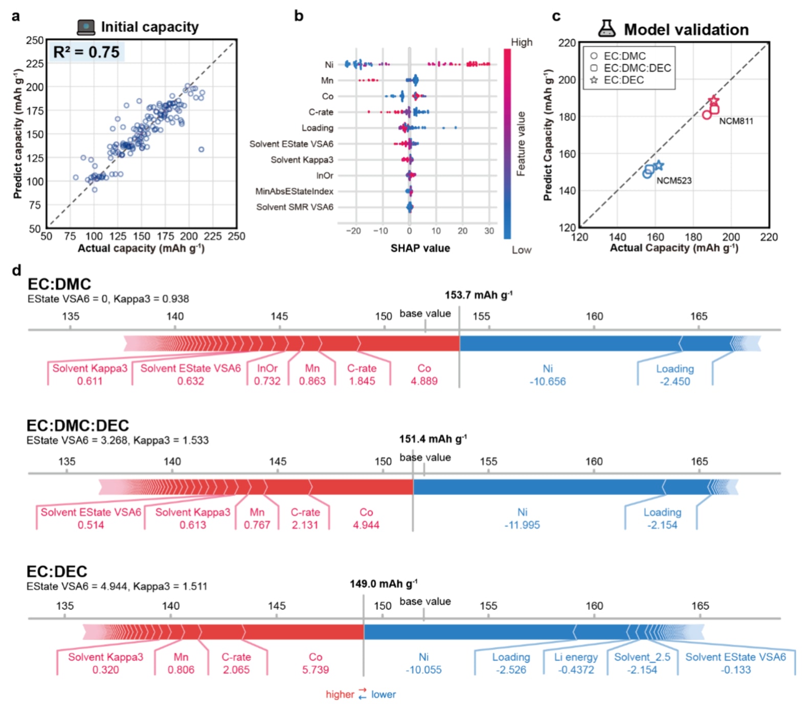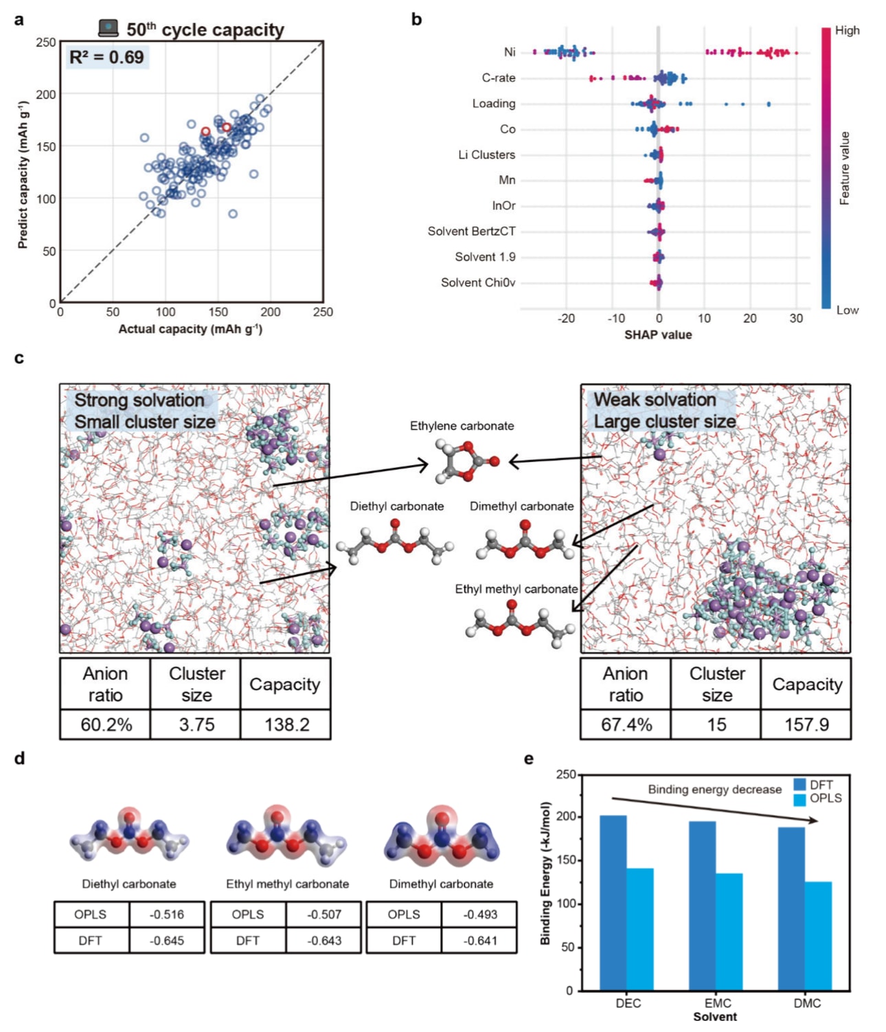 为分析材料—性能关系,基于所构建的数据库,开发了一个利用材料信息预测循环寿命的机器学习模型。通过特征重要性分析和SHAP分析,识别出影响循环性能的关键材料因素。模型的预测性能通过实验验证得到确认。此外,还基于挖掘得到的数据开展分子模拟,以研究电解液在原子尺度上的行为。通过这一集成方法(图1b),加深了对电池组分与循环性能之间关系的理解。